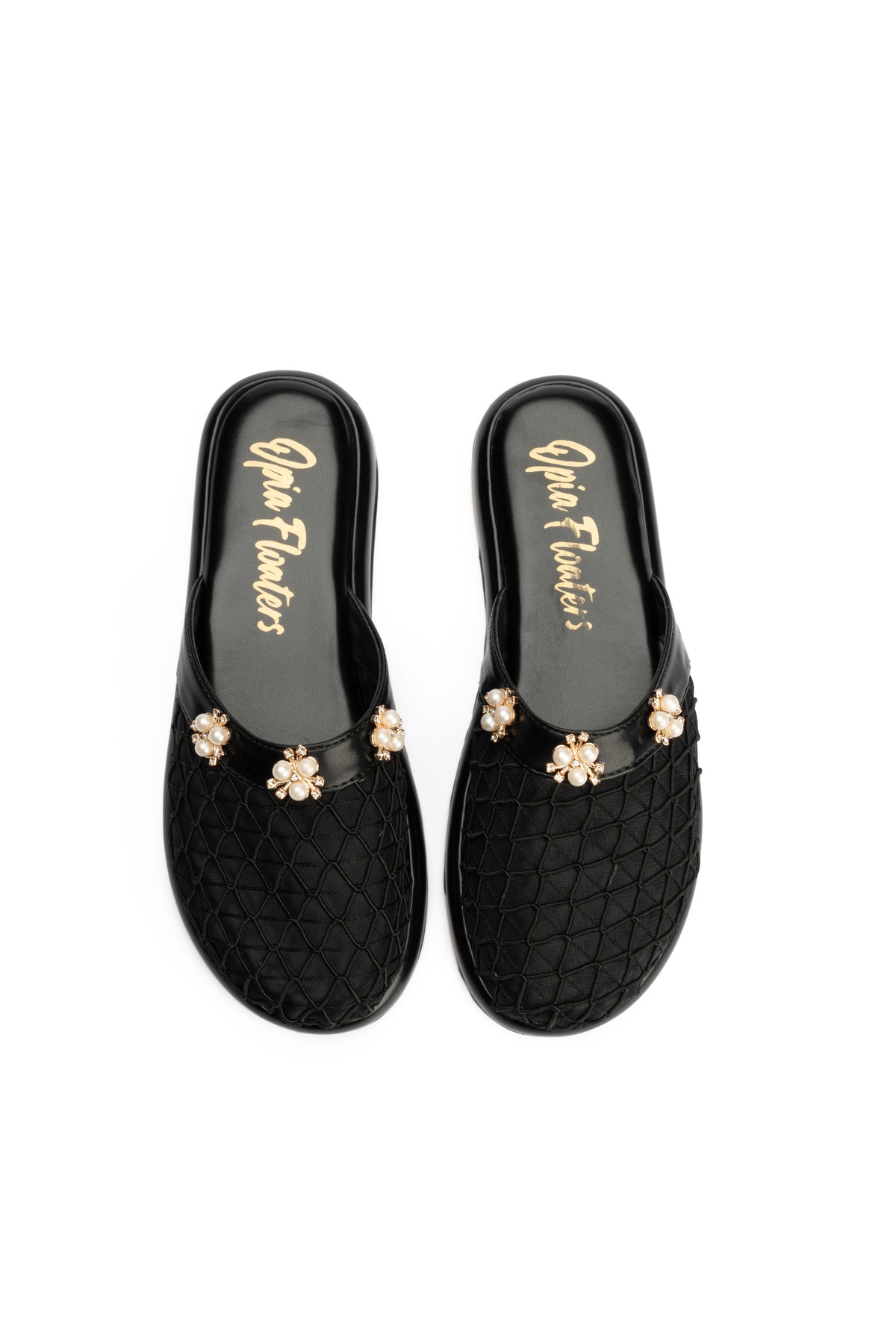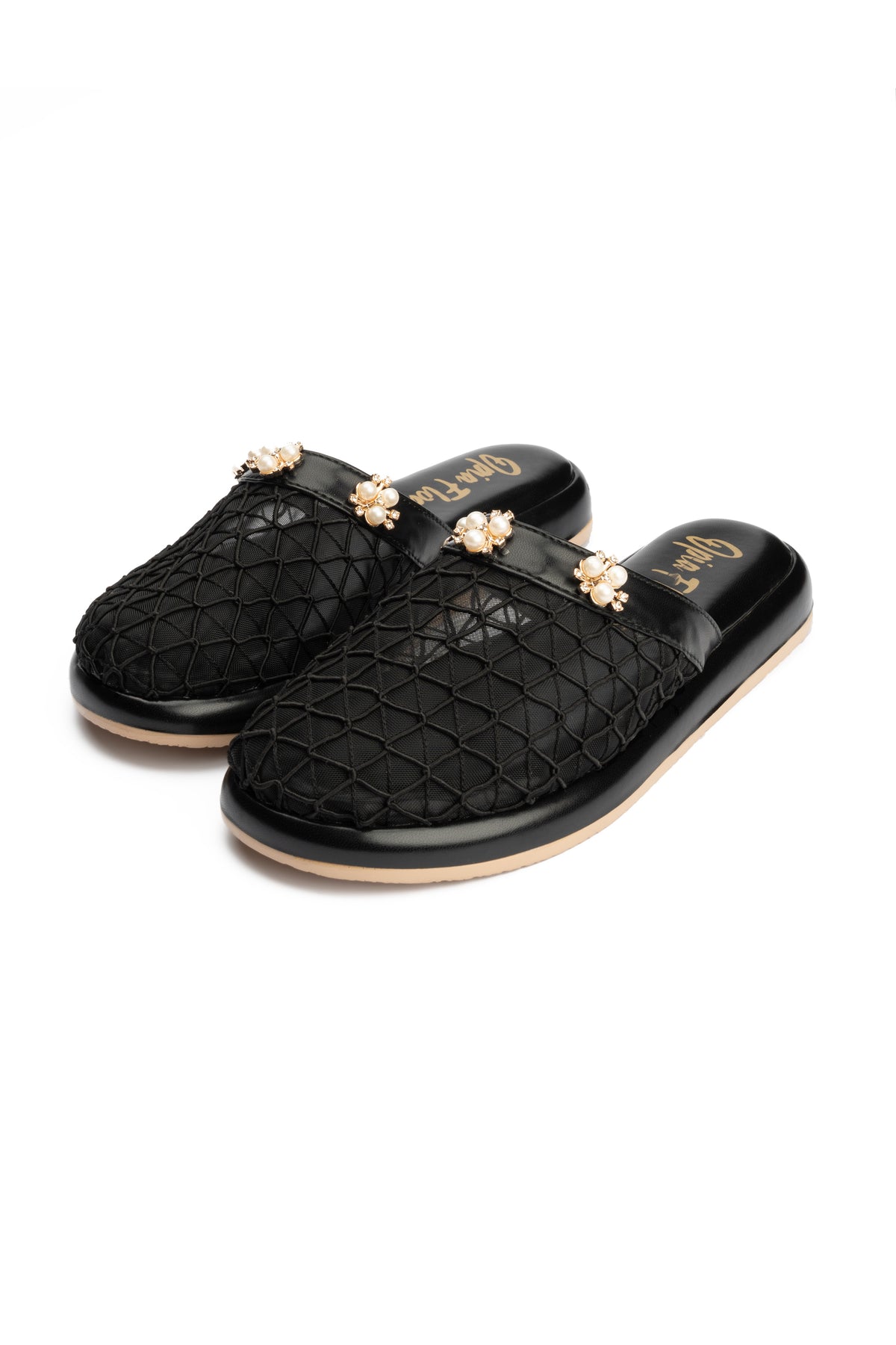 These stylish black mule slippers combine breathable comfort with elegant detailing for effortless everyday wear. They are designed with a lightweight air mesh upper and pearl buckle accents that offer a refined look while keeping your feet comfortable throughout the day.
