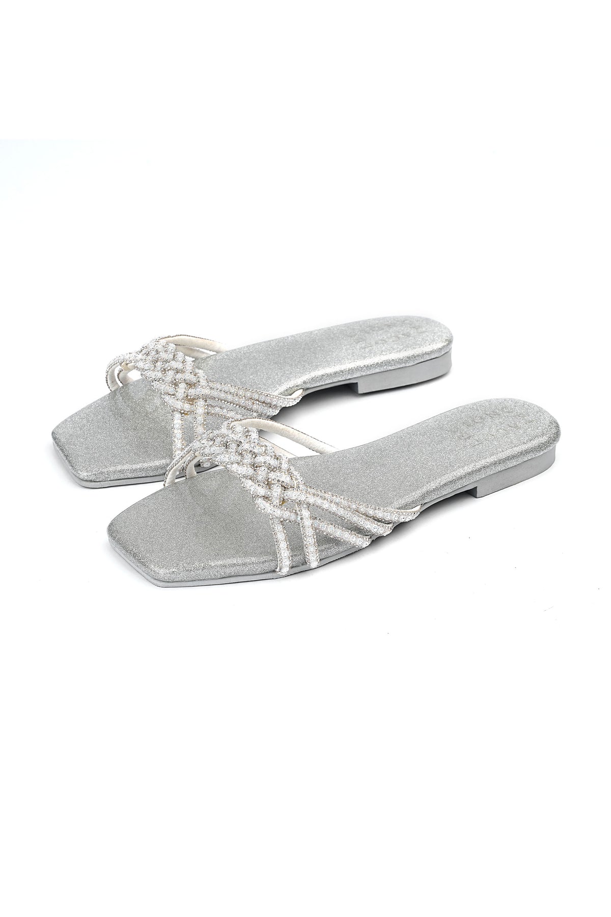 These chic silver flats come with a fancy braided mesh upper and glittery accents for a festive finish.