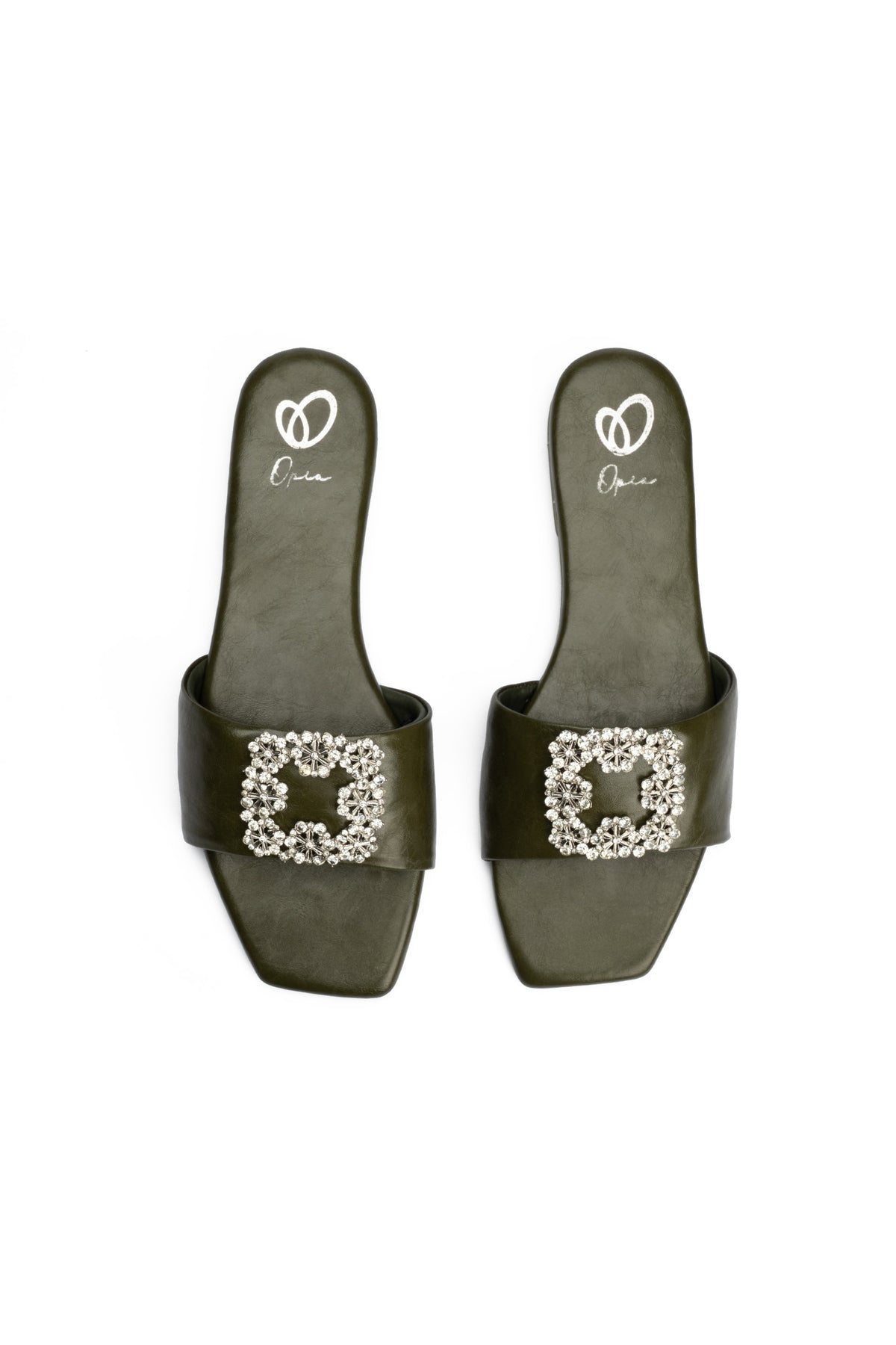 Elegant in design, these green flat slippers featuring a comfort padded vegan leather upper with exclusive stone buckle detailing on top for a stylish finish. They are designed for everyday ease and pair lightweight comfort with dependable durability.