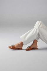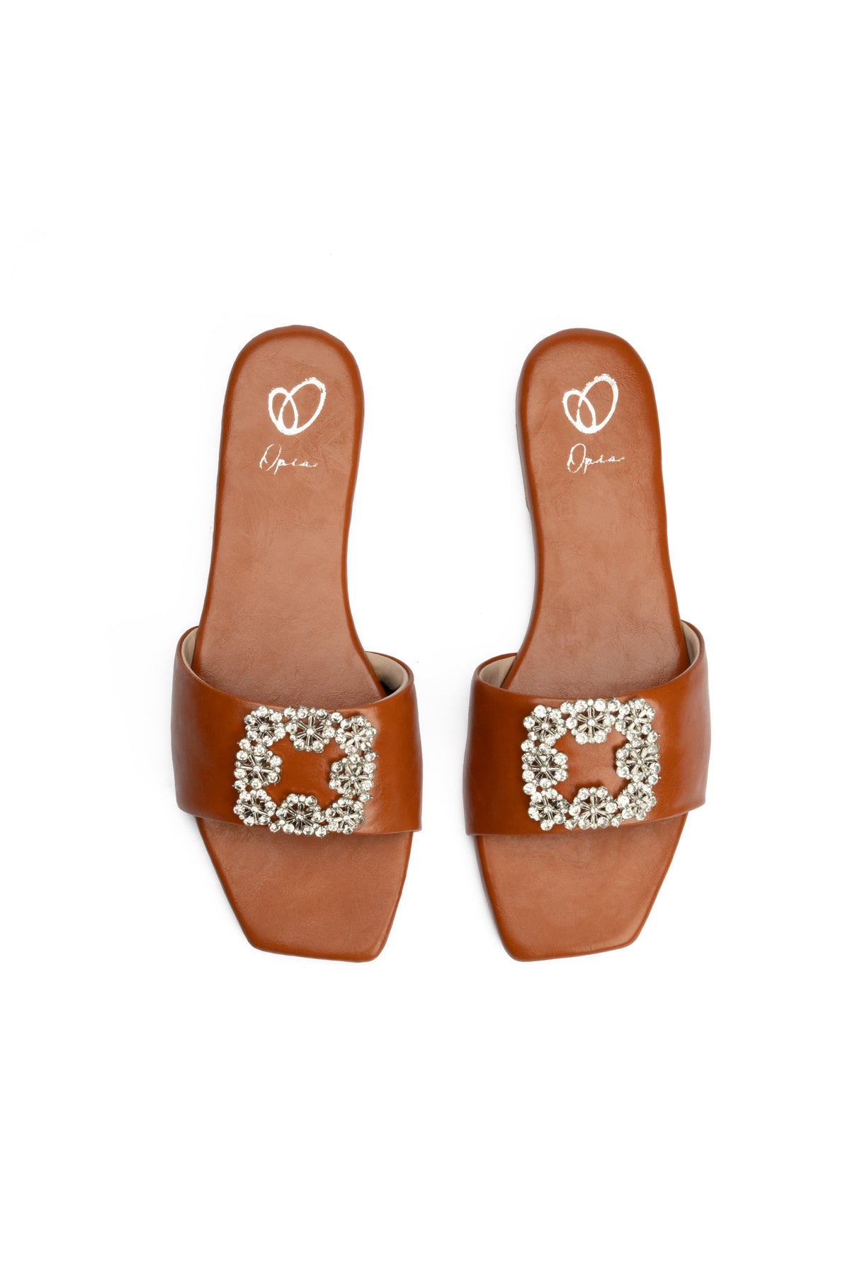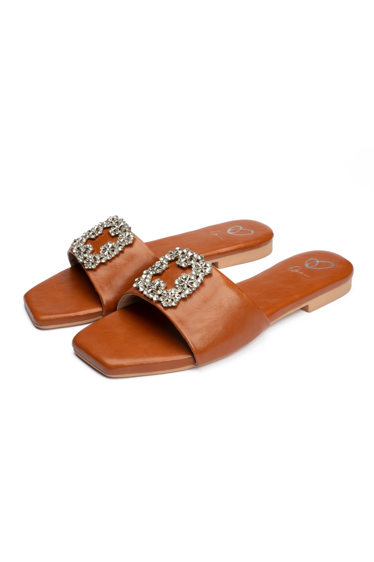 Elegant in design, these tan flat slippers featuring a comfort padded vegan leather upper with exclusive stone buckle detailing on top for a stylish finish. They are designed for everyday ease and pair lightweight comfort with dependable durability.