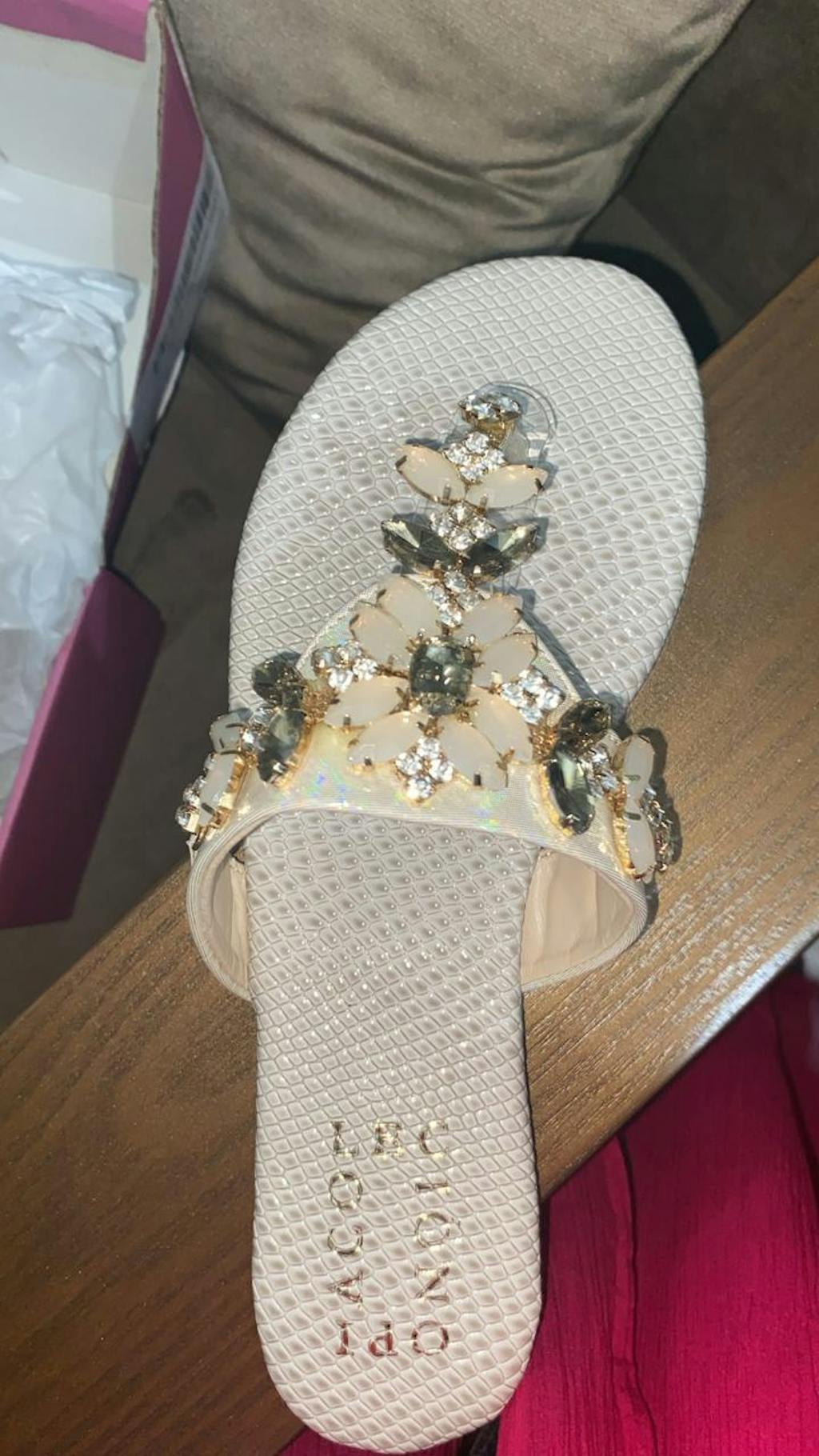 - Two-tone faux leather and clear plastic upper with premium stone buckle details