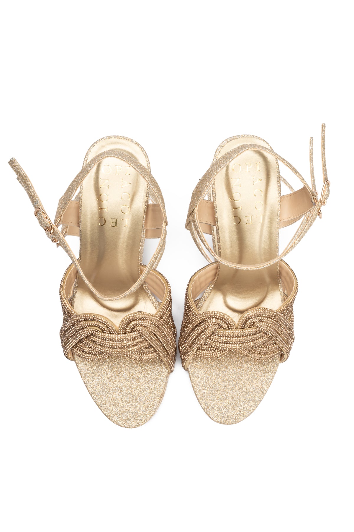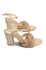 Gold in color, these fancy heel sandals feature a striking combination of mesh rope and glitter fabric upper that adds a refined sparkle to any festive or evening outfit. The microfiber lining and padded glitter insole ensure lasting comfort while maintaining a stylish finish.