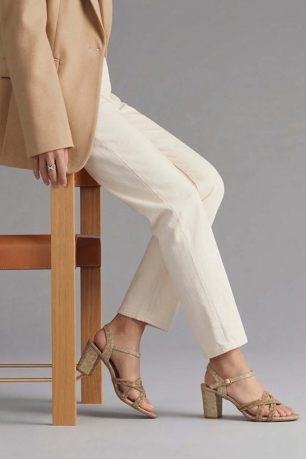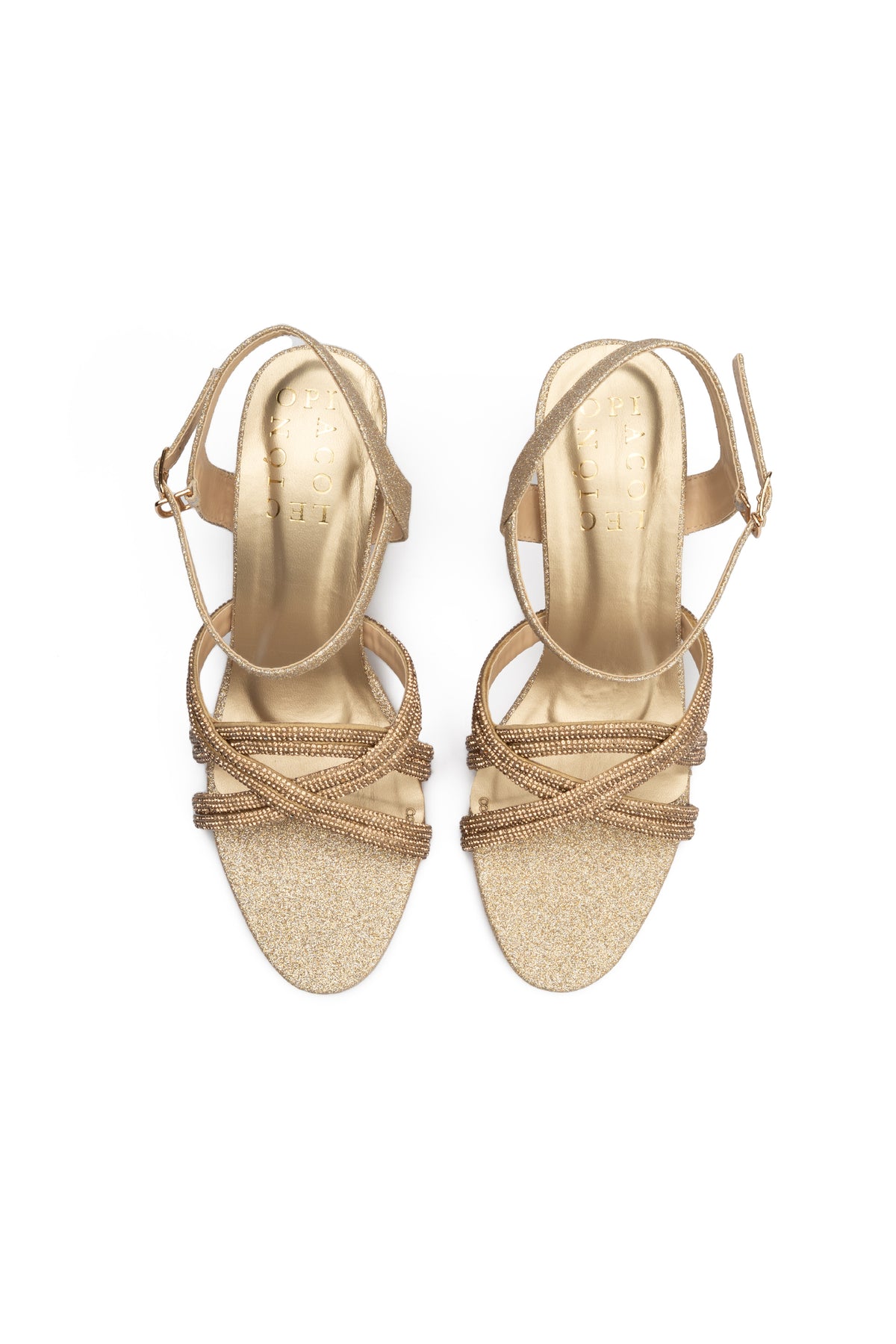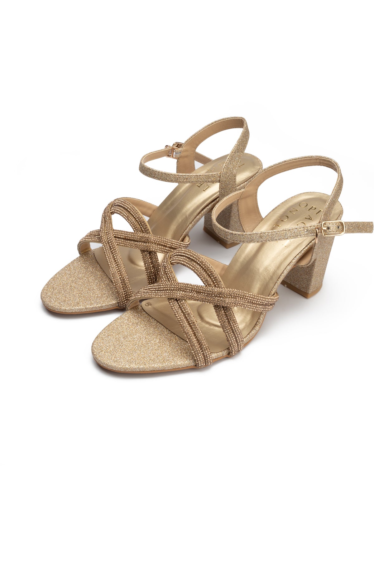 Designed for special occasions, these gold heel sandals feature a shimmering mesh rope upper for an elegant finish. The glitter-padded insole and durable rubber sole ensure both comfort and confident movement.