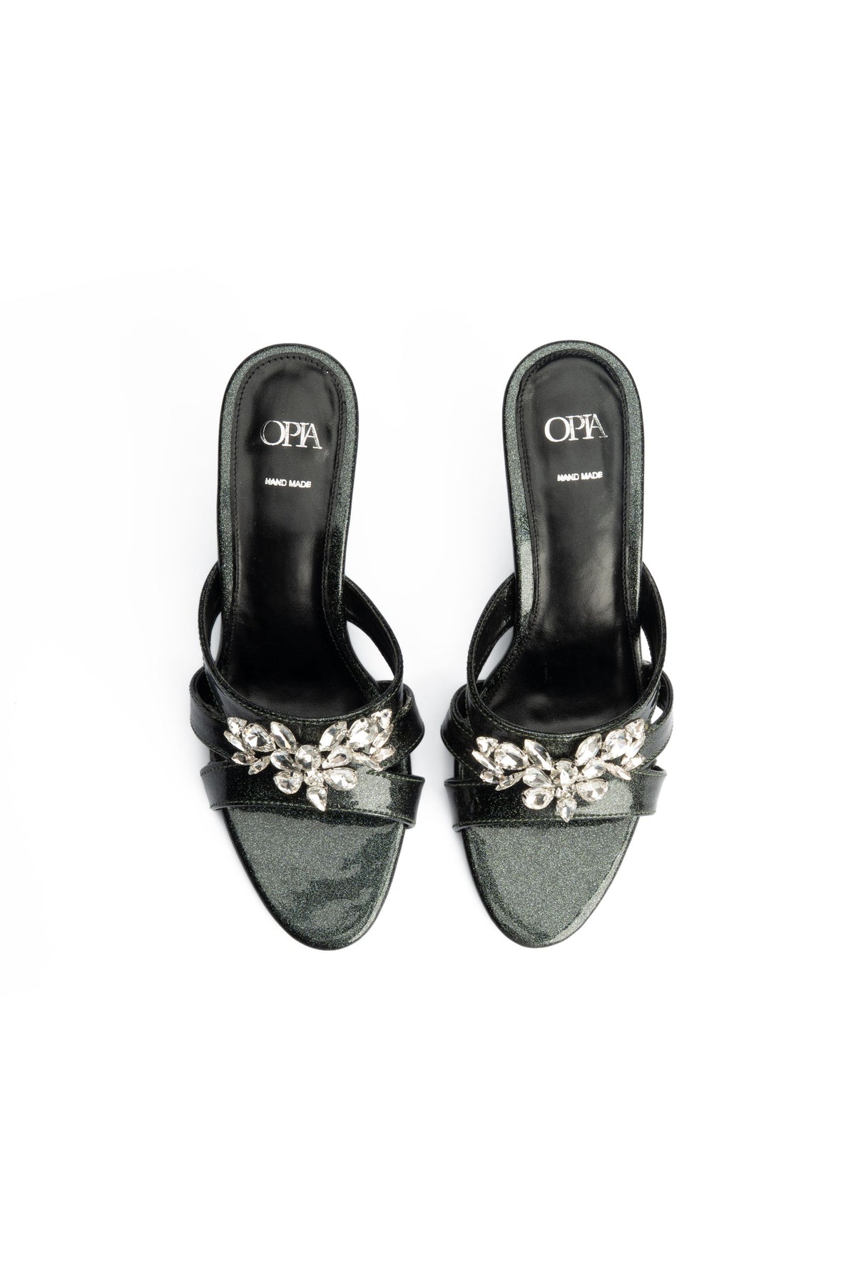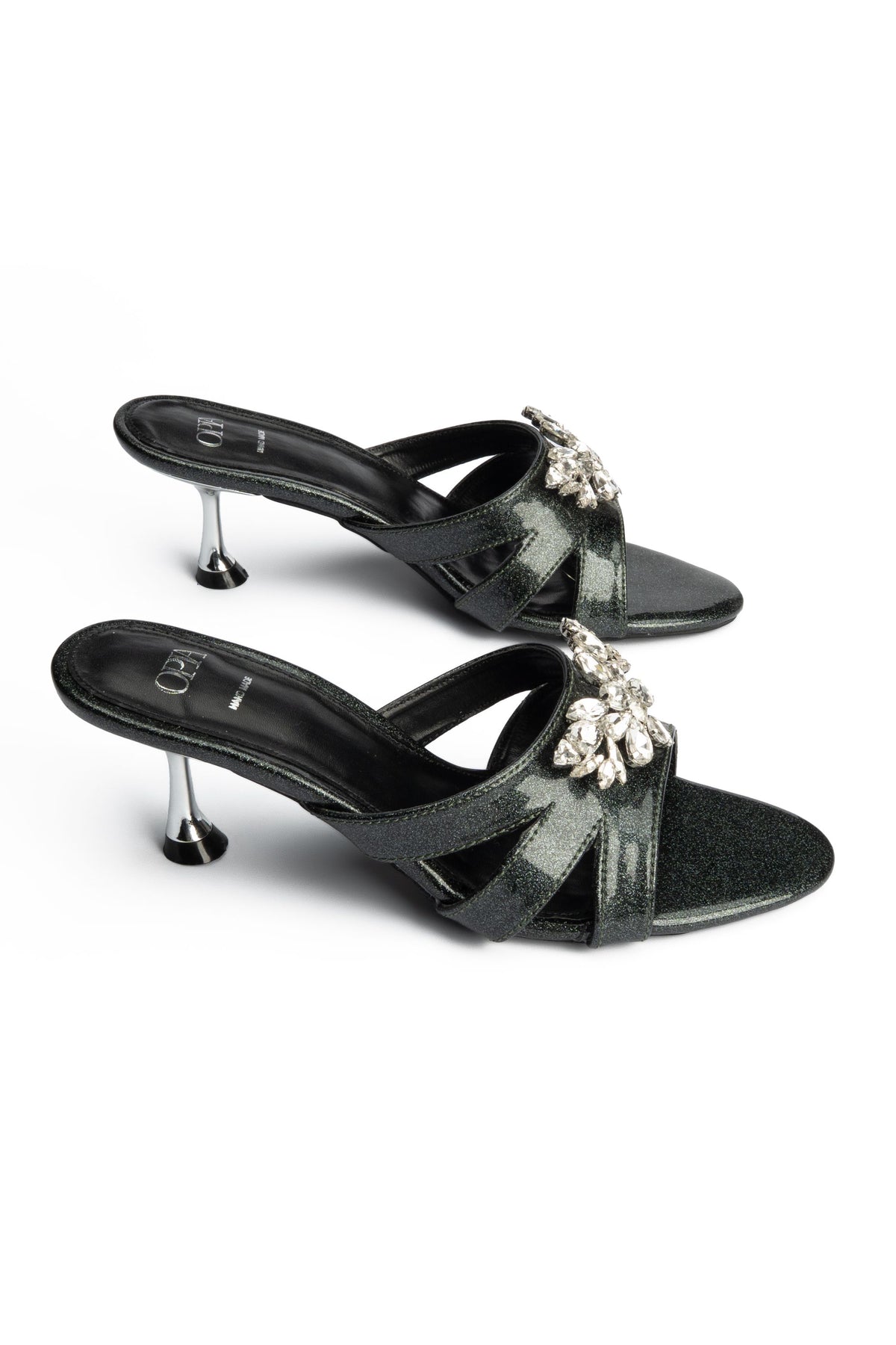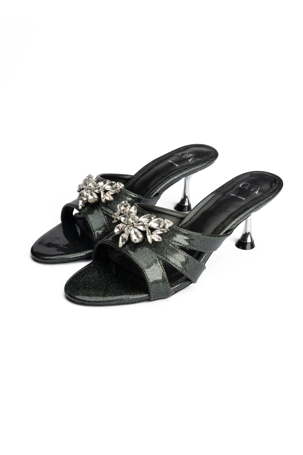 This fancy green heel (55mm) slipper is designed to make a statement, it features a glittery high-shine faux leather upper adorned with premium stone buckle details. The soft padded insole and sleek silver heel offer both comfort and elegance, making it a perfect choice for festive and evening wear.