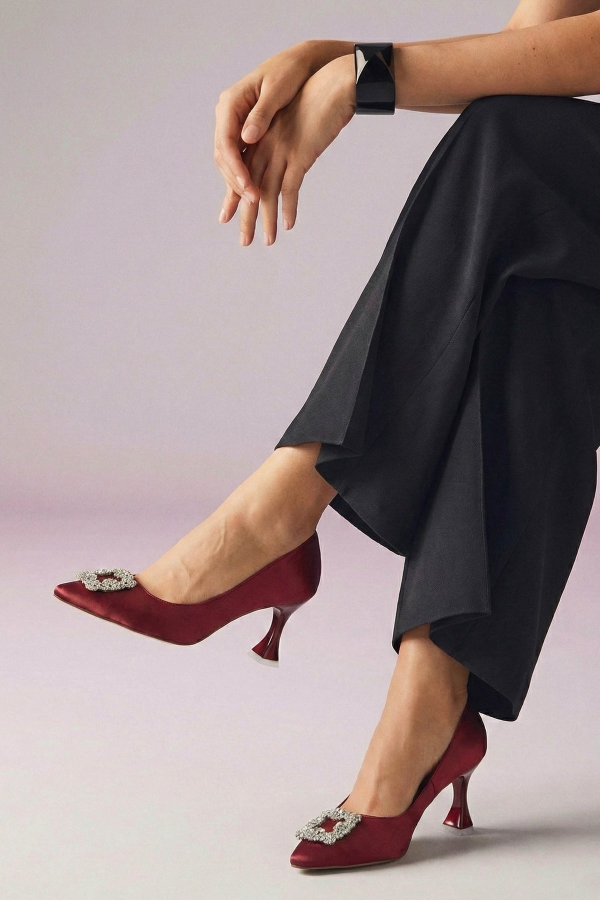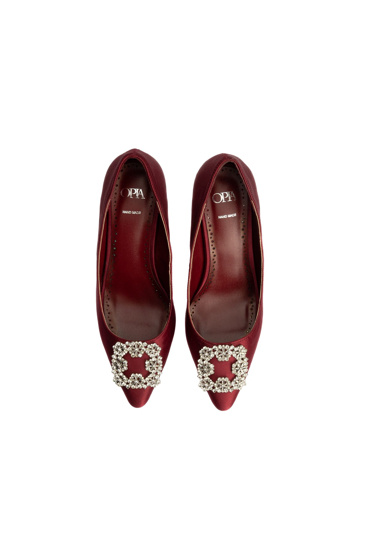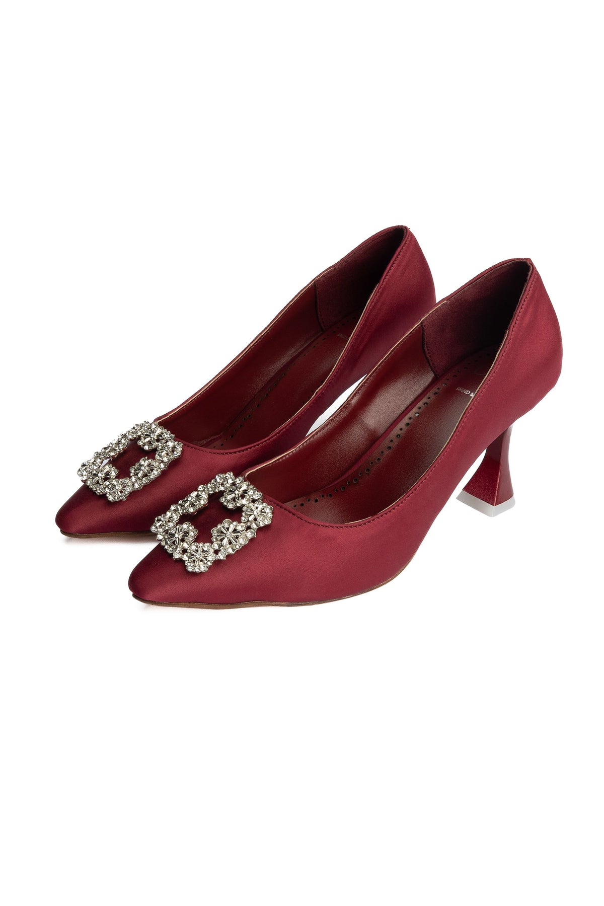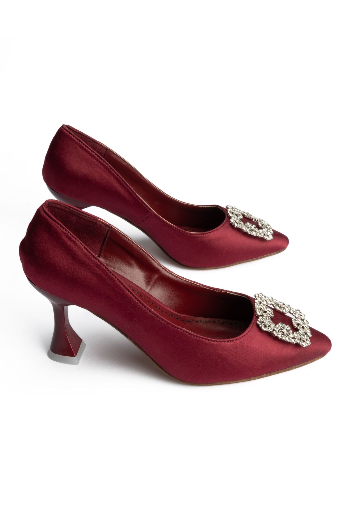 Timeless and elegant, these maroon court shoes feature a satin fabric upper accented with premium stone buckle details. The glitter outsole adds a subtle sparkle to formal looks.