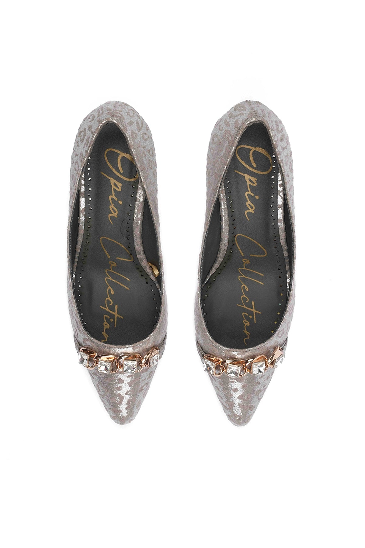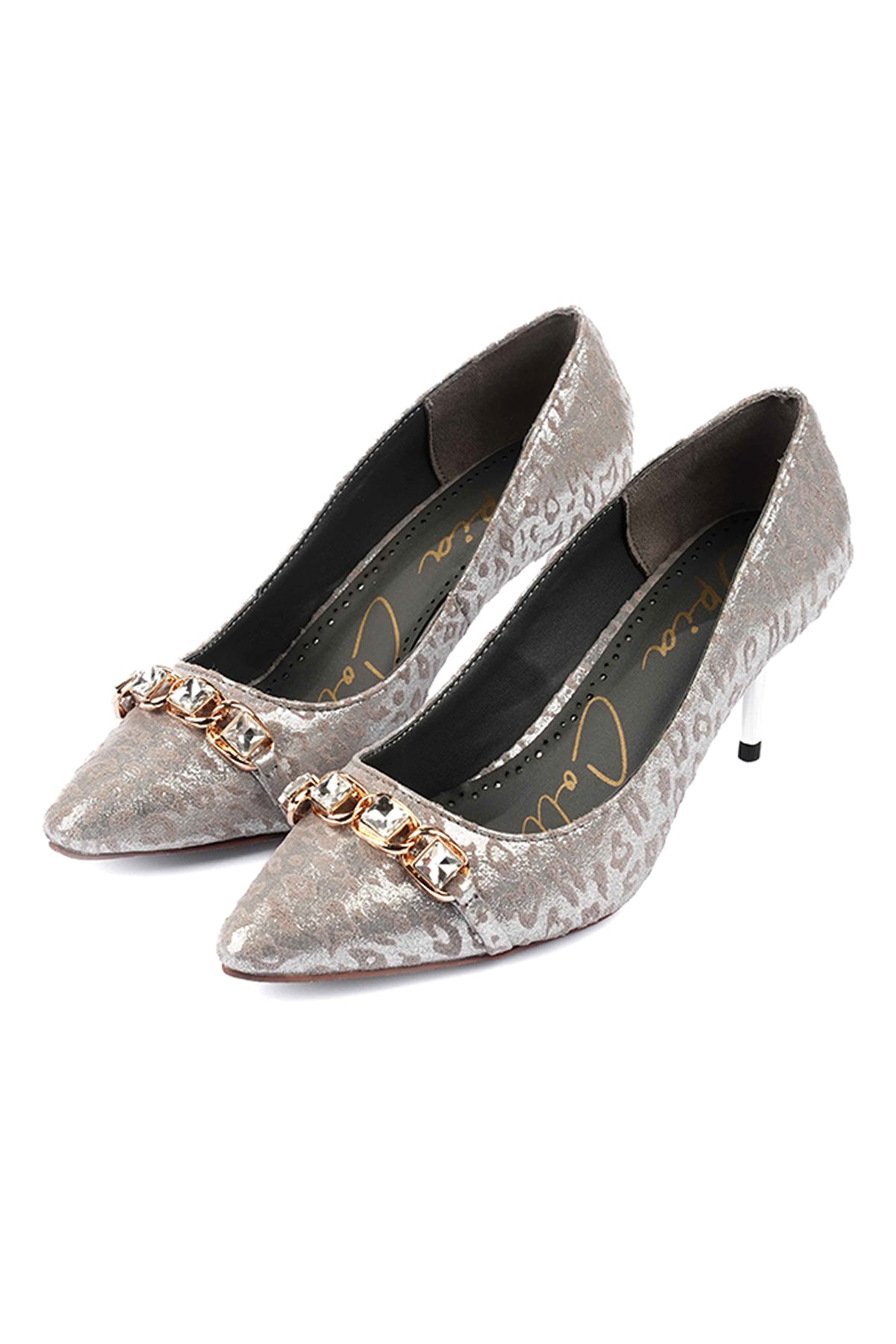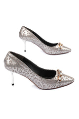 These ladies’ court shoes feature a leopard-textured metallic faux leather upper paired with premium buckle detailing for a luxurious finish. The comfort-padded insole and premium stiletto heel 75 mm offer style and support, while the glittery outsole adds a glamorous vibe to every step.