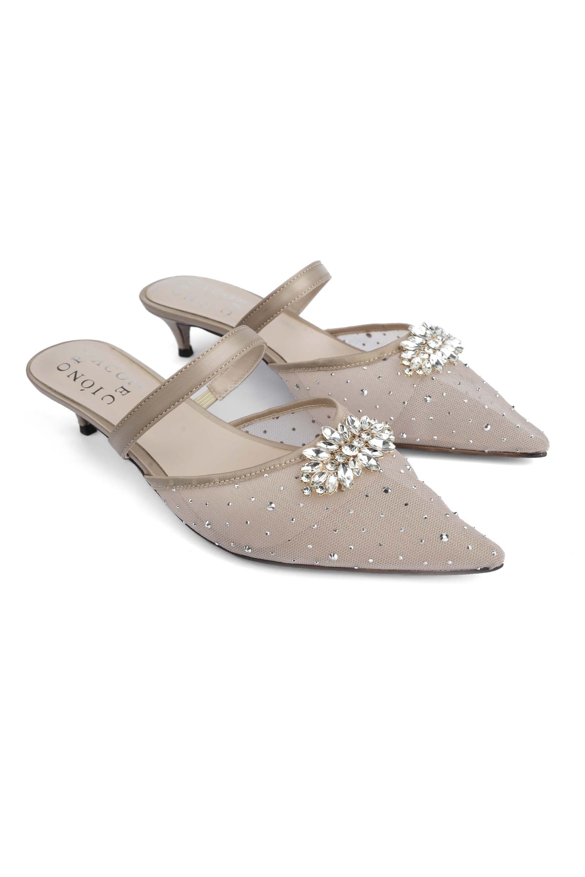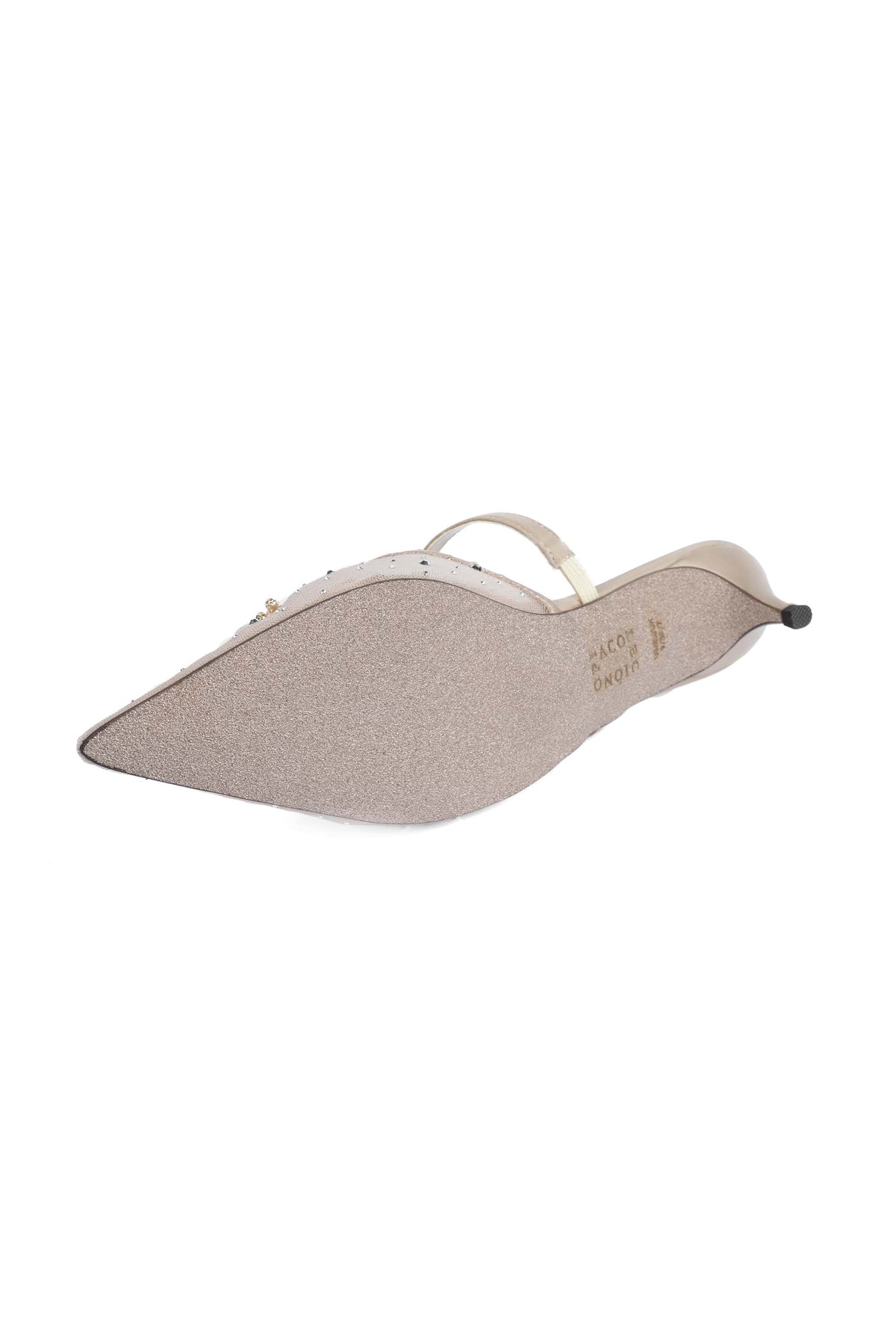 Elegant and glamorous, this gold fancy ladies’ mule features a stone-embedded net upper enhanced with premium stone buckle details for a luxurious look. The satin fabric back strap provides better grip and comfort, while the kitten heel (39 mm) adds graceful elevation, perfect for festive and evening wear.