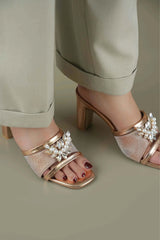 Elevate your elegance with these stunning heels featuring a luxurious peach finish and a beautiful pearl brooch on top, adding a touch of sophistication to any outfit.