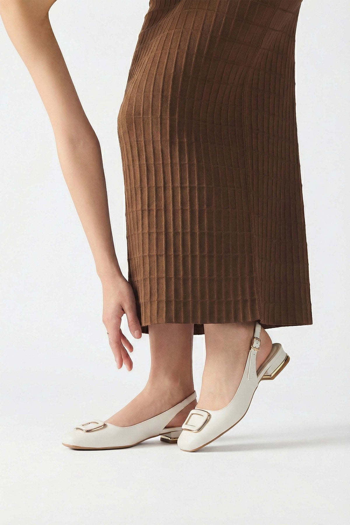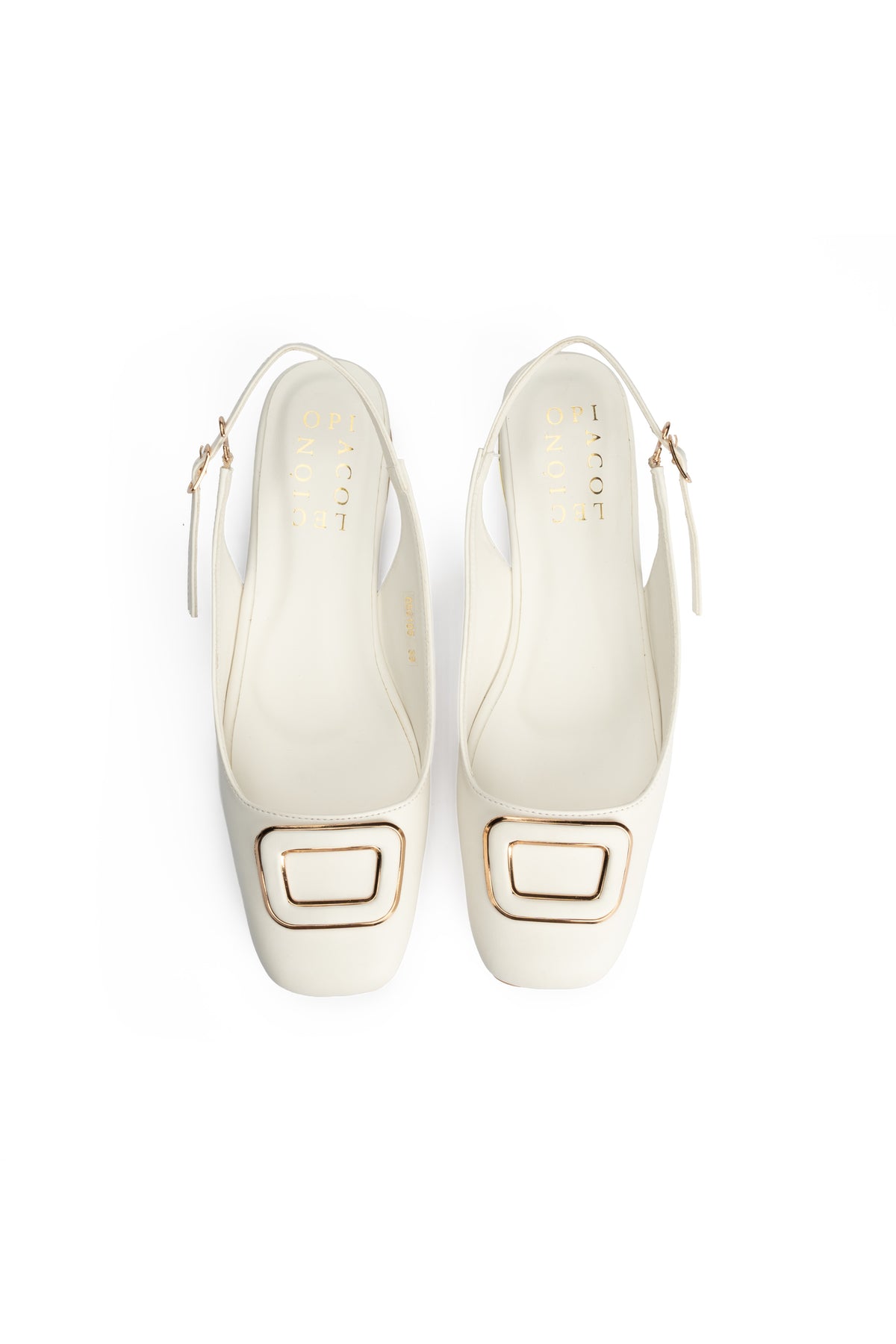Designed for versatile styling, these white slingback pumps offer a polished finish with subtle metal buckle detailing. The low heel and cushioned insole make them perfect for long hours of wear.