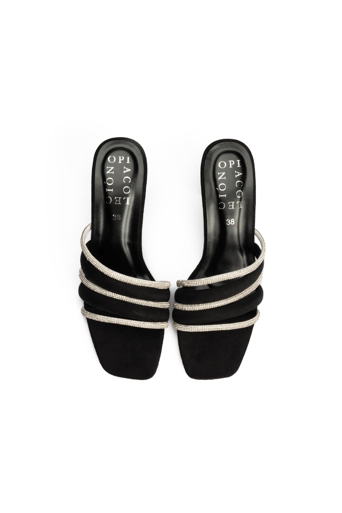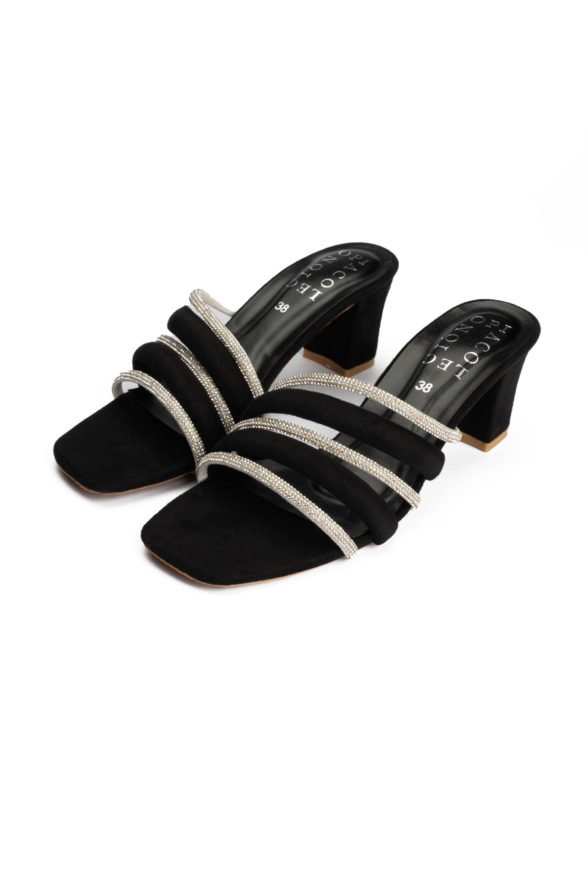 These elegant black heel slippers combine vegan leather with a fancy mesh rope upper, creating a stylish and modern look. They are designed for comfort and stability which is ideal for festive wear and evening outings.