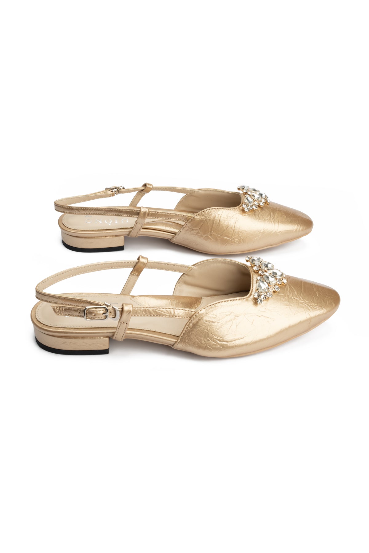 These gold winter sandals blend shimmer and comfort, featuring crinkled metallic faux leather and premium stone buckle details. The double-foam padded insole makes them ideal for extended wear.