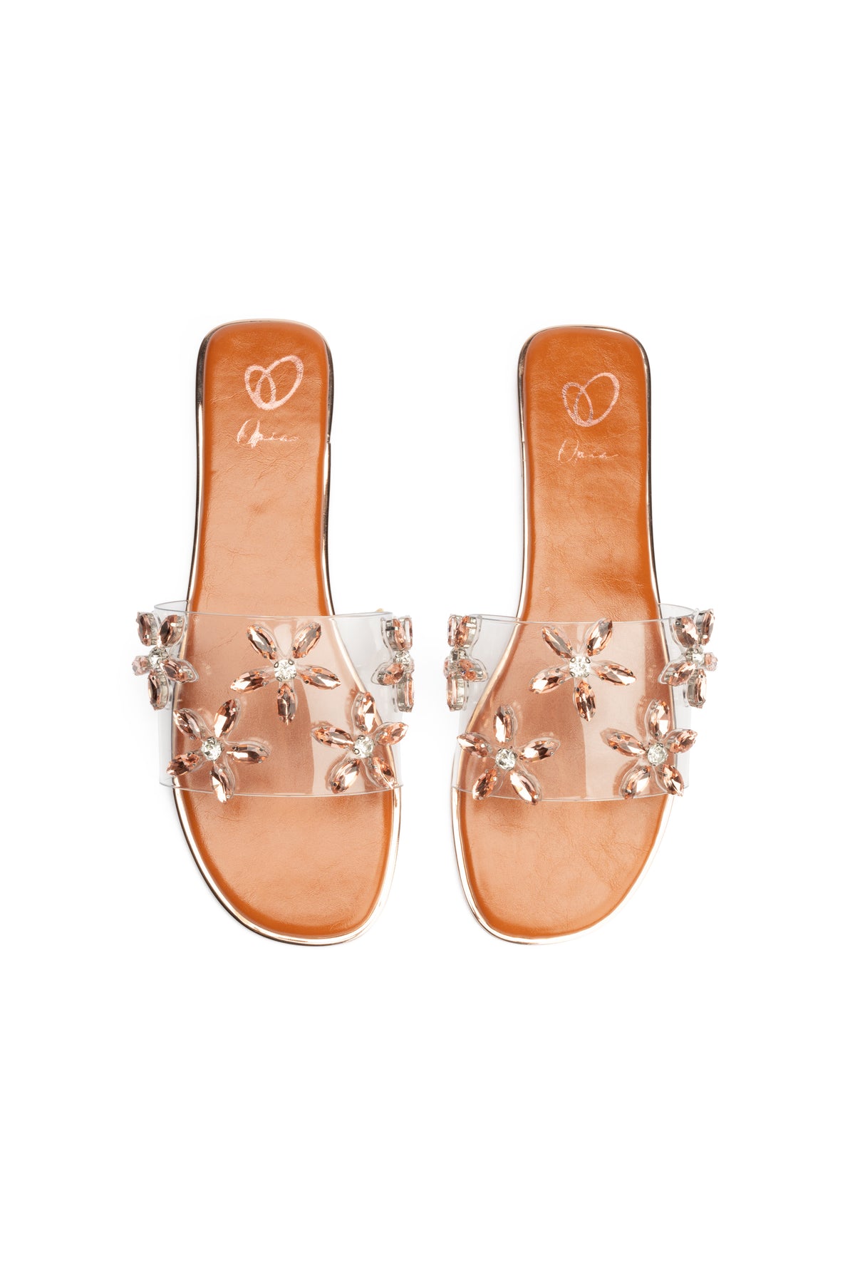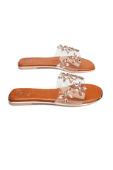 These stylish tan flat slides feature a soft clear plastic upper embedded with exclusive stones, creating a chic and elegant appearance. The padded vegan leather insole and detailed outsole ensure comfort and durability for everyday wear.