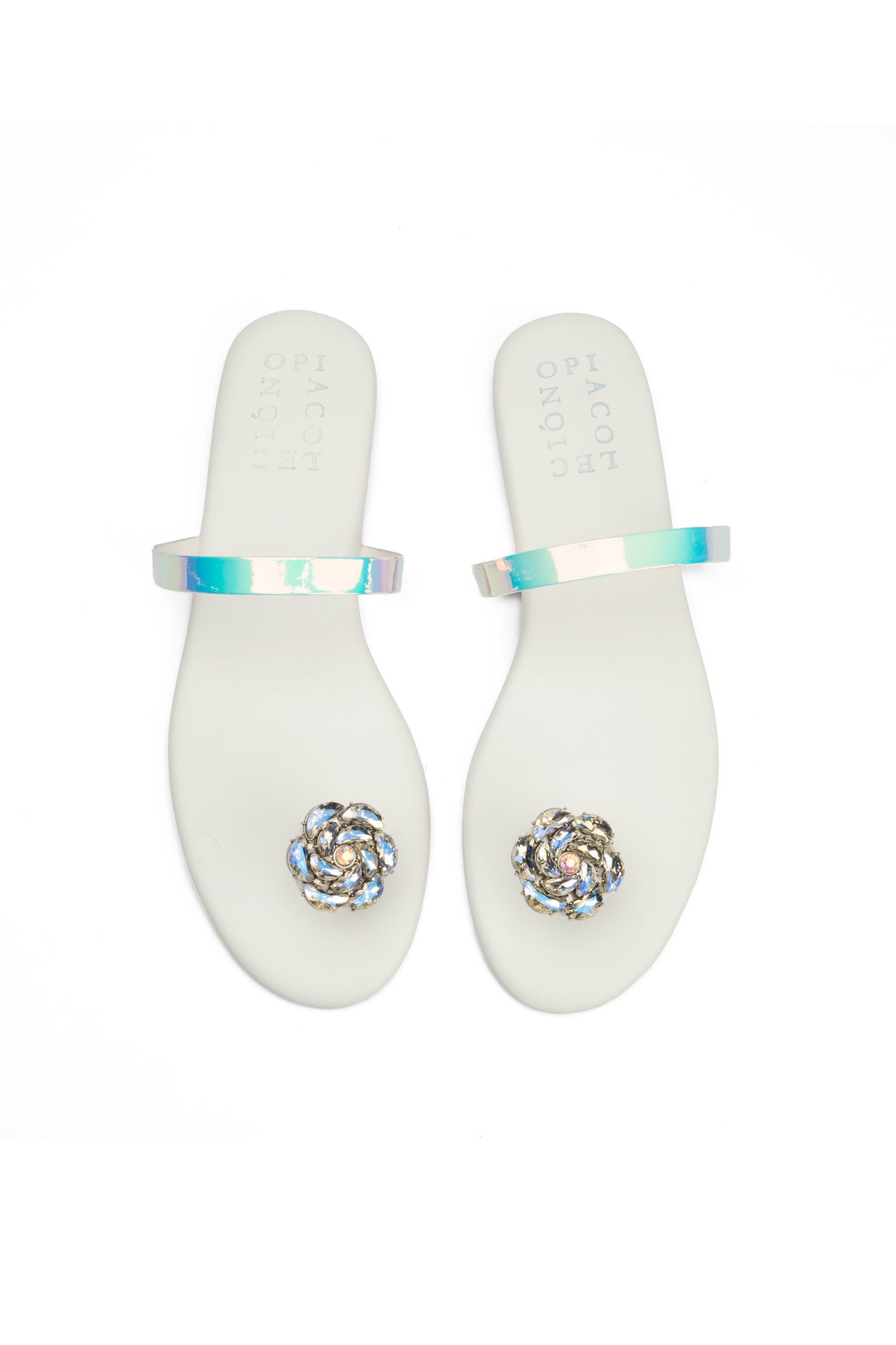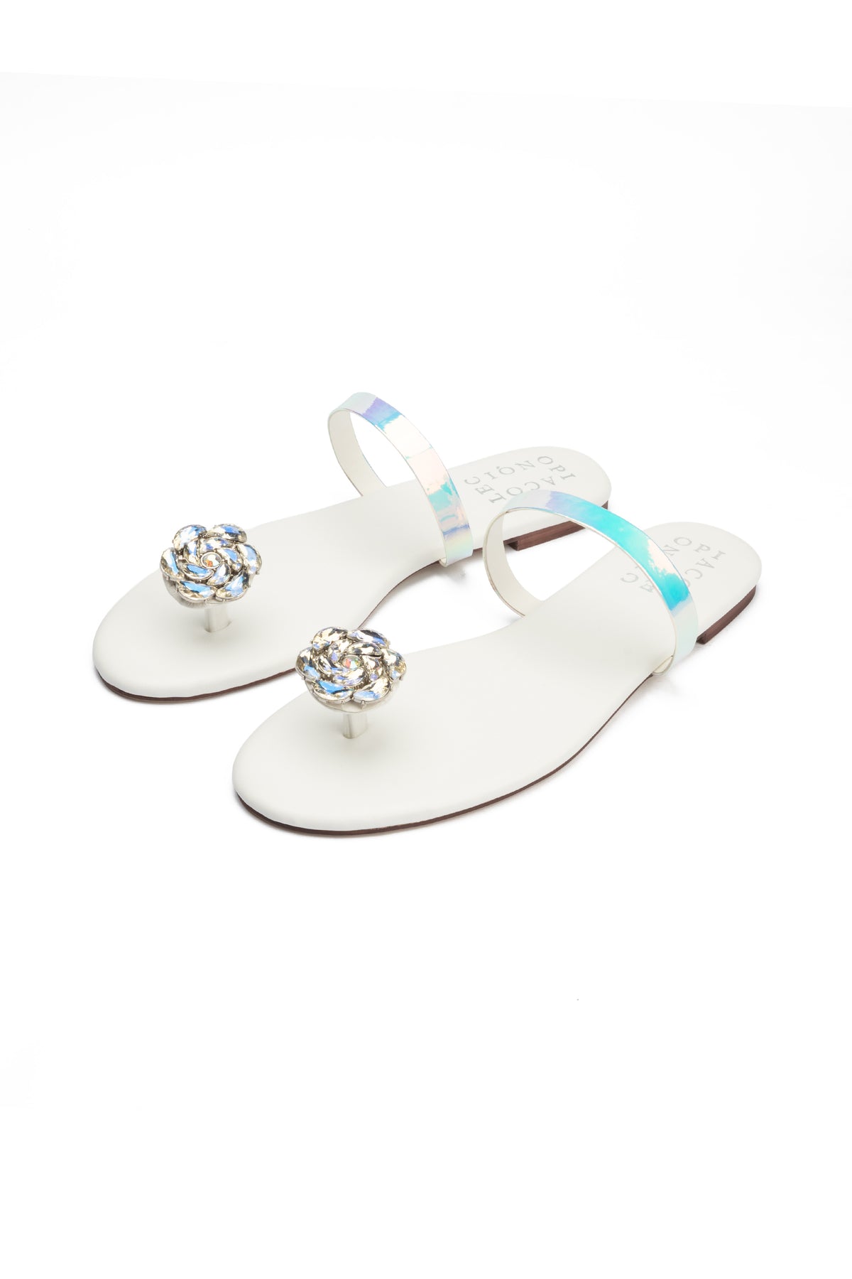 These fashionable white flat slides feature a two-tone acrylic strap paired with a stone-embedded flower buckle for an elegant and secure fit. The padded vegan leather insole ensures comfort while maintaining a stylish look.