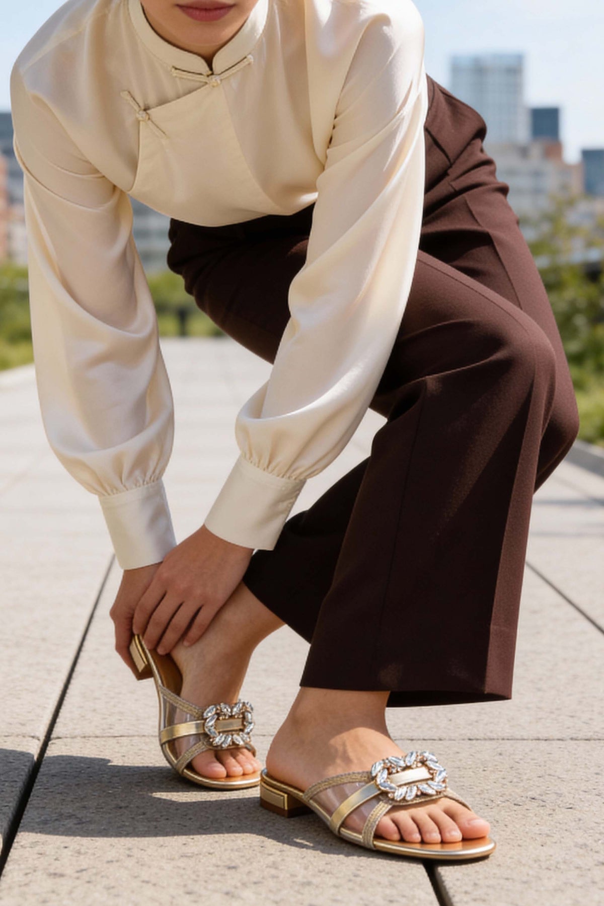 Step into festive elegance with these statement golden flats. This exquisite piece combines metallic golden faux leather with a decorative metal buckle and gleaming block heel. It is especially designed for celebratory occasions as they complement both traditional and contemporary looks.
