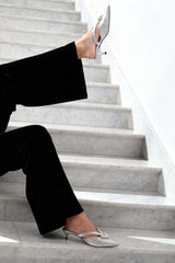 Elegant and eye-catching, these gold fancy ladies’ mules feature a two-tone metallic faux leather upper with elastic straps for a comfortable fit. The fancy buckle is on top is paired with comfort padded insole and a 39 mm kitten heel for glam.
