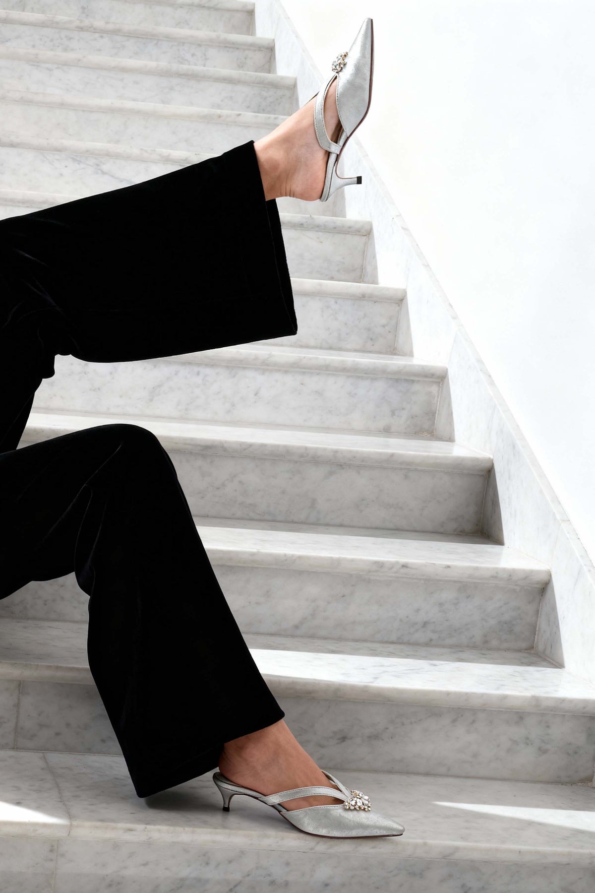 Elegant and eye-catching, these silver fancy ladies’ mules feature a two-tone metallic faux leather upper with elastic straps for a comfortable fit. The fancy buckle is on top is paired with comfort padded insole and a 39 mm kitten heel for glam.