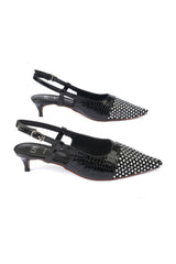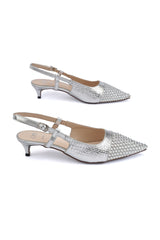 Stylish and elegant, these peach fancy sling-back mules feature a stunning combination of fancy stone net and metallic crocodile-printed faux leather upper. They are designed for both comfort and glamour, this 39mm kitten heel has a comfort padded insole and a rubber sole for stability.