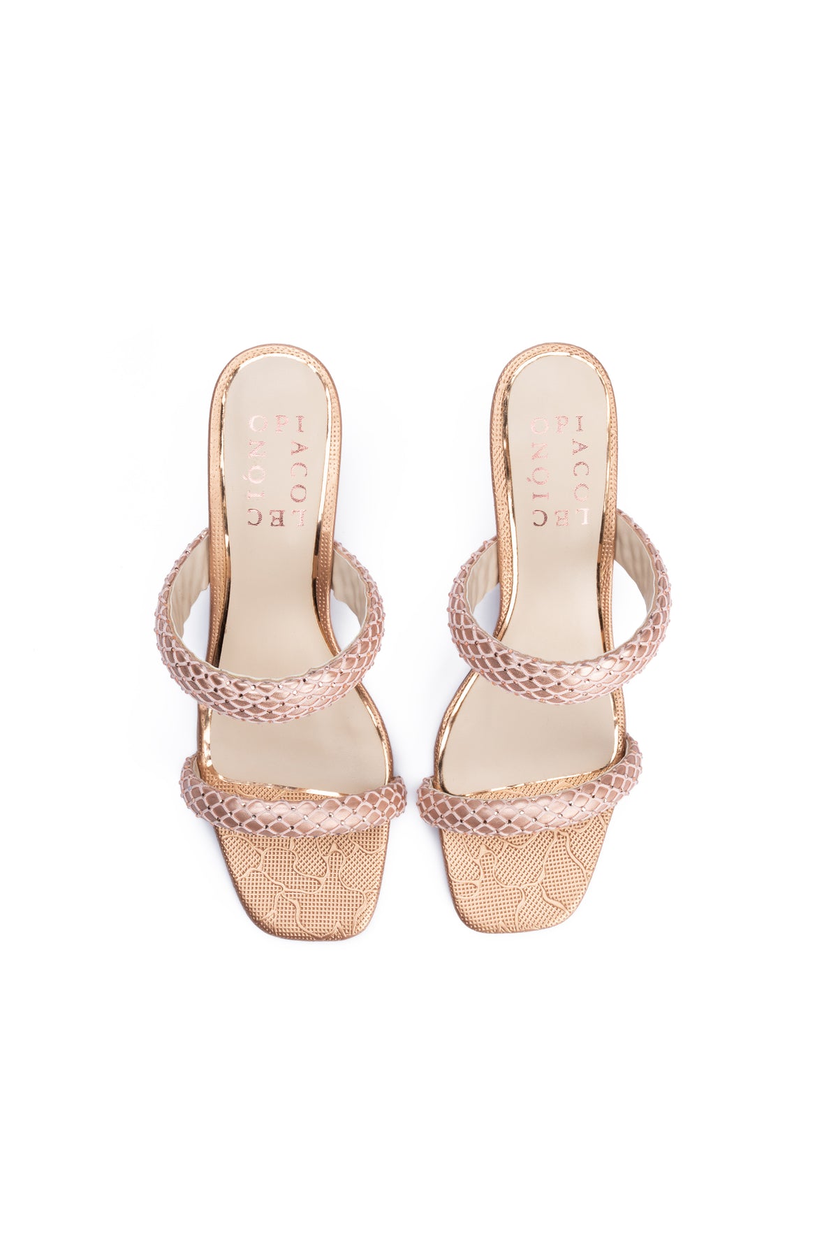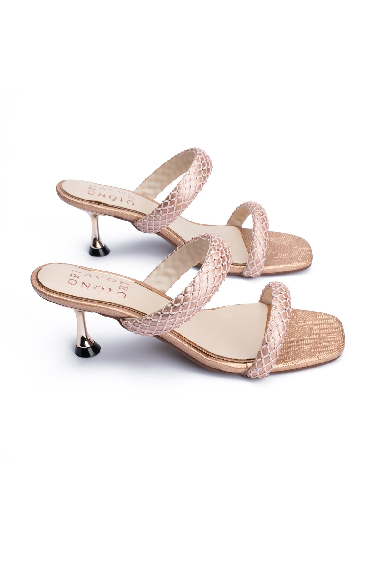 These elegant peach heel slides are designed to make a statement with their shimmering details and refined silhouette. They feature a stone-embedded mesh upper and an exclusive stiletto heel that brings together glamour and comfort for special occasions and evening wear.