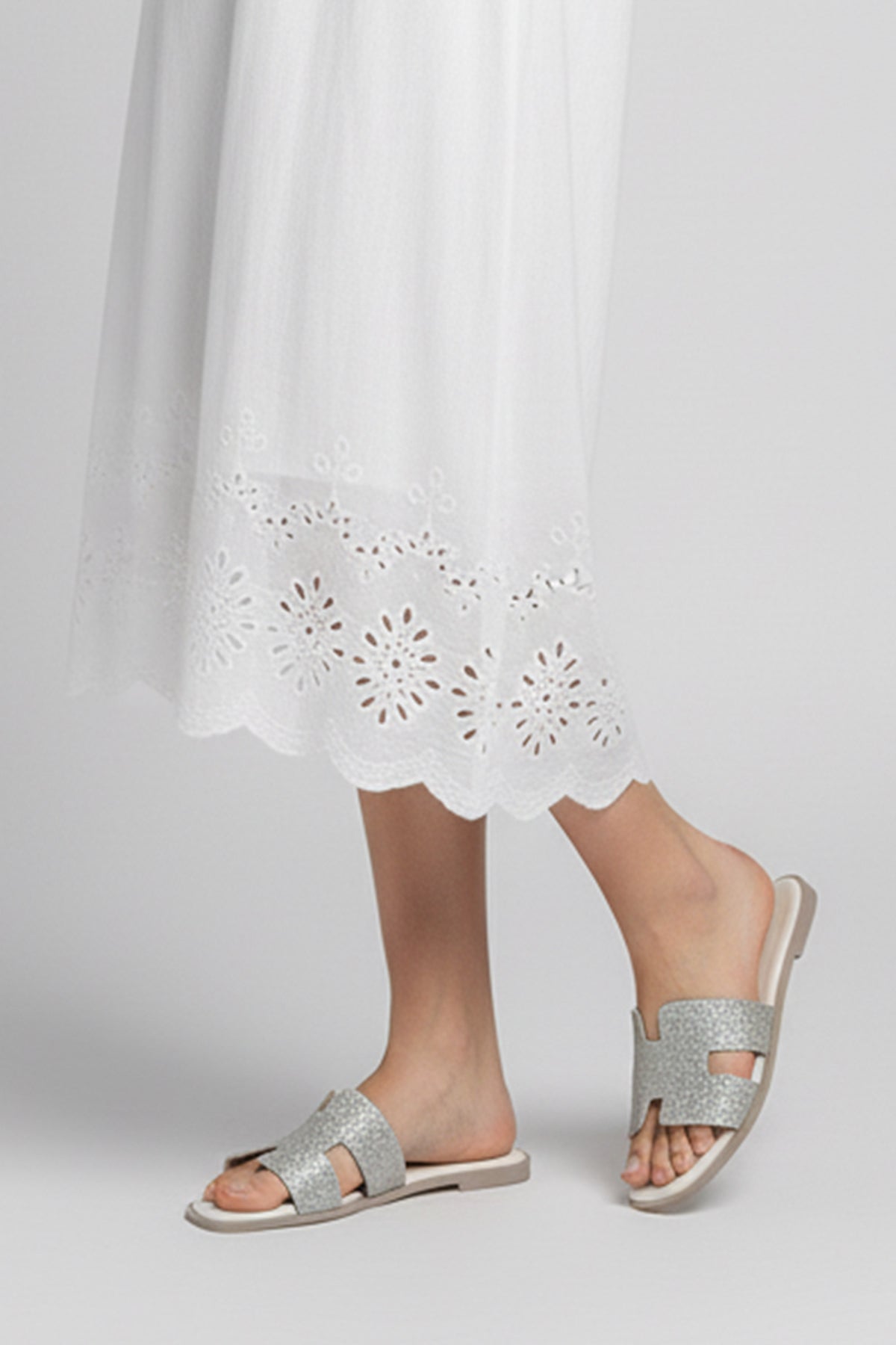 Chic and playful, these white flats combine a delicate satin base with a glittery fabric upper, ideal for adding a pop of glamour to any outfit.