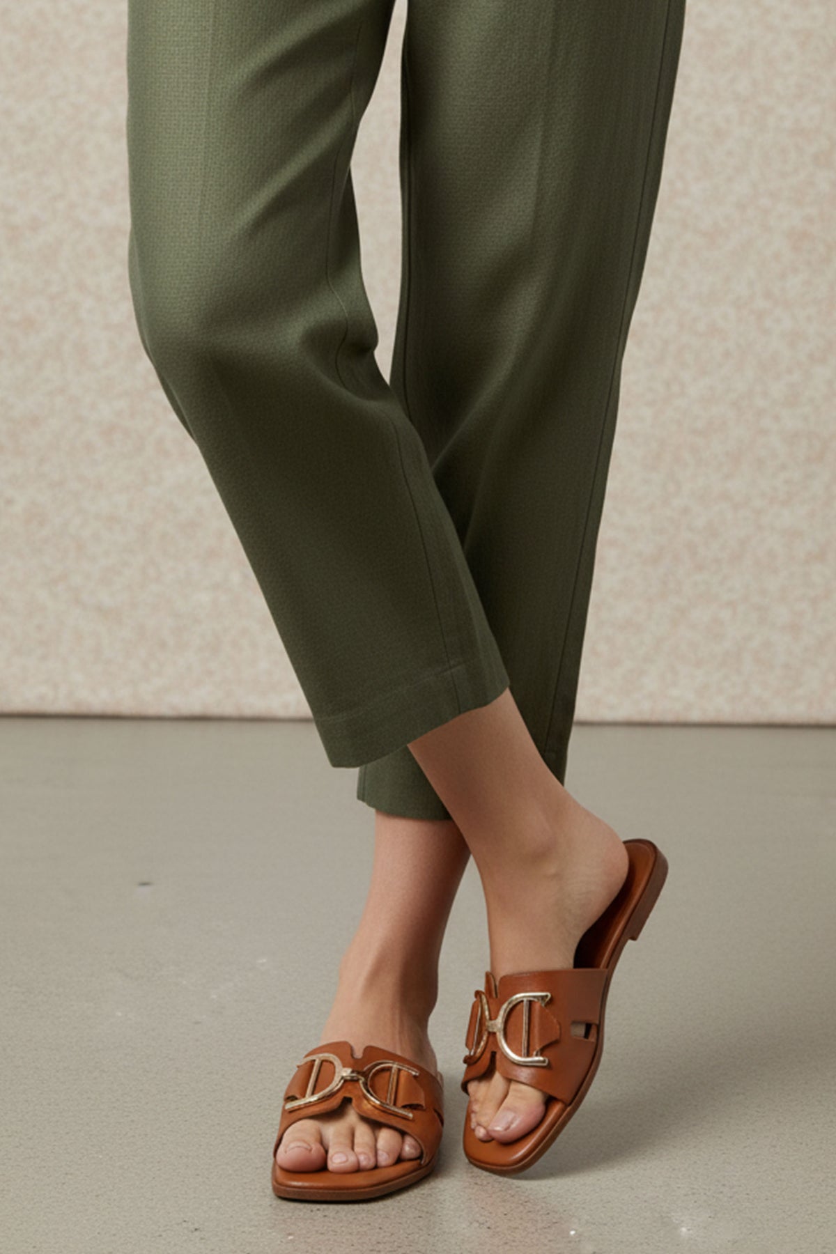 Refined yet relaxed, these tan flats are adorned with a chic gold buckle, offering timeless style and all-day comfort.
