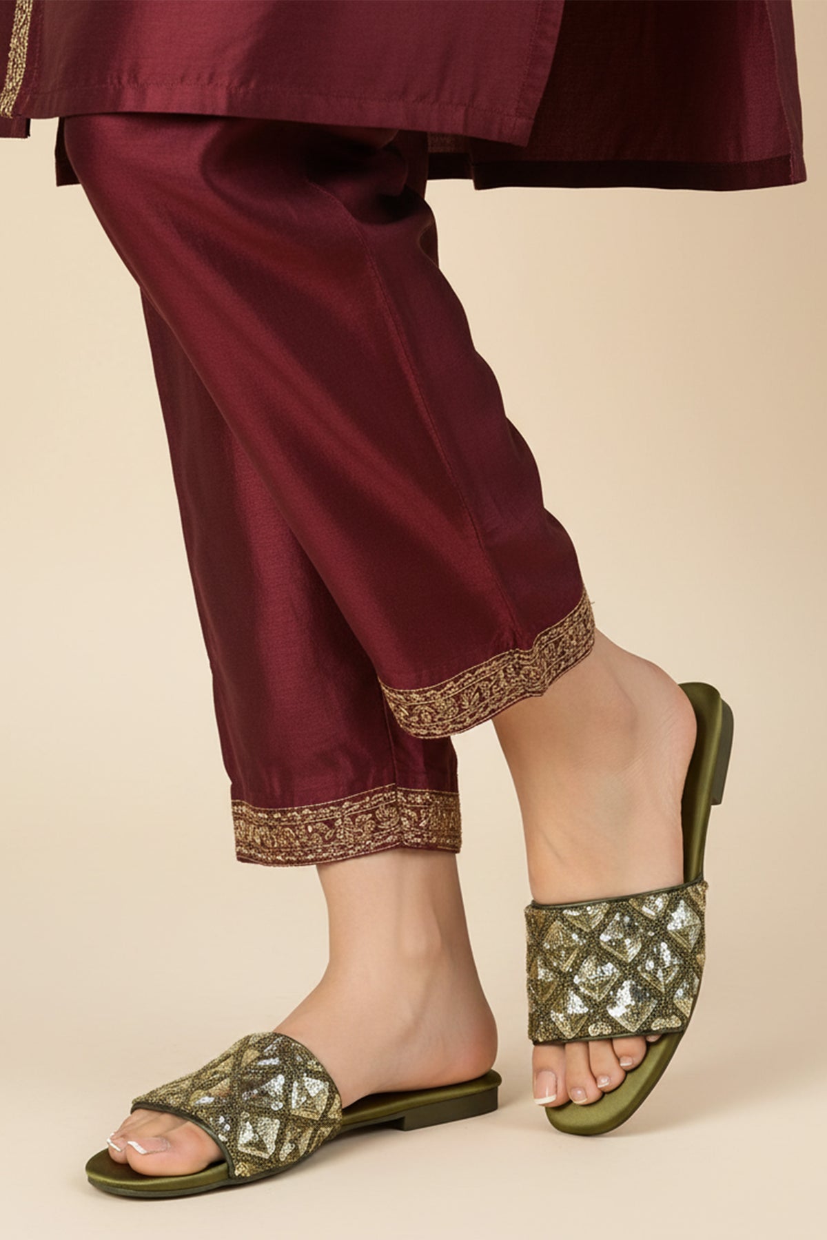 Olive flats with a sequin-patterned upper and satin insole, designed for everyday sophistication.