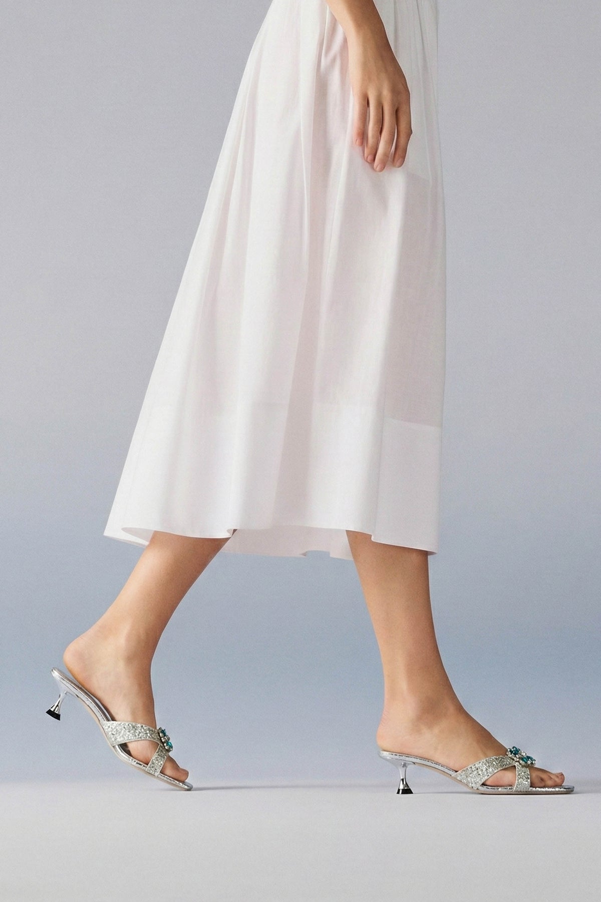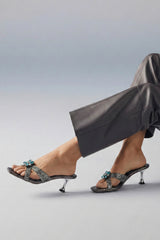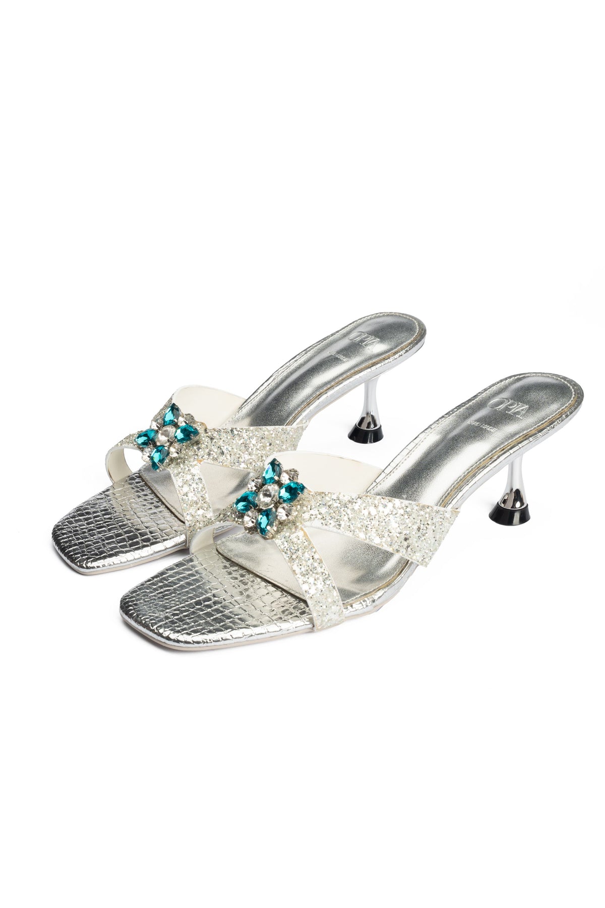 White in color, this fancy heel slipper features a glitter vegan leather upper with premium stone buckle detailing for a glamorous look. It is designed with a padded insole and silver heel, and it offers both elegance and comfort.