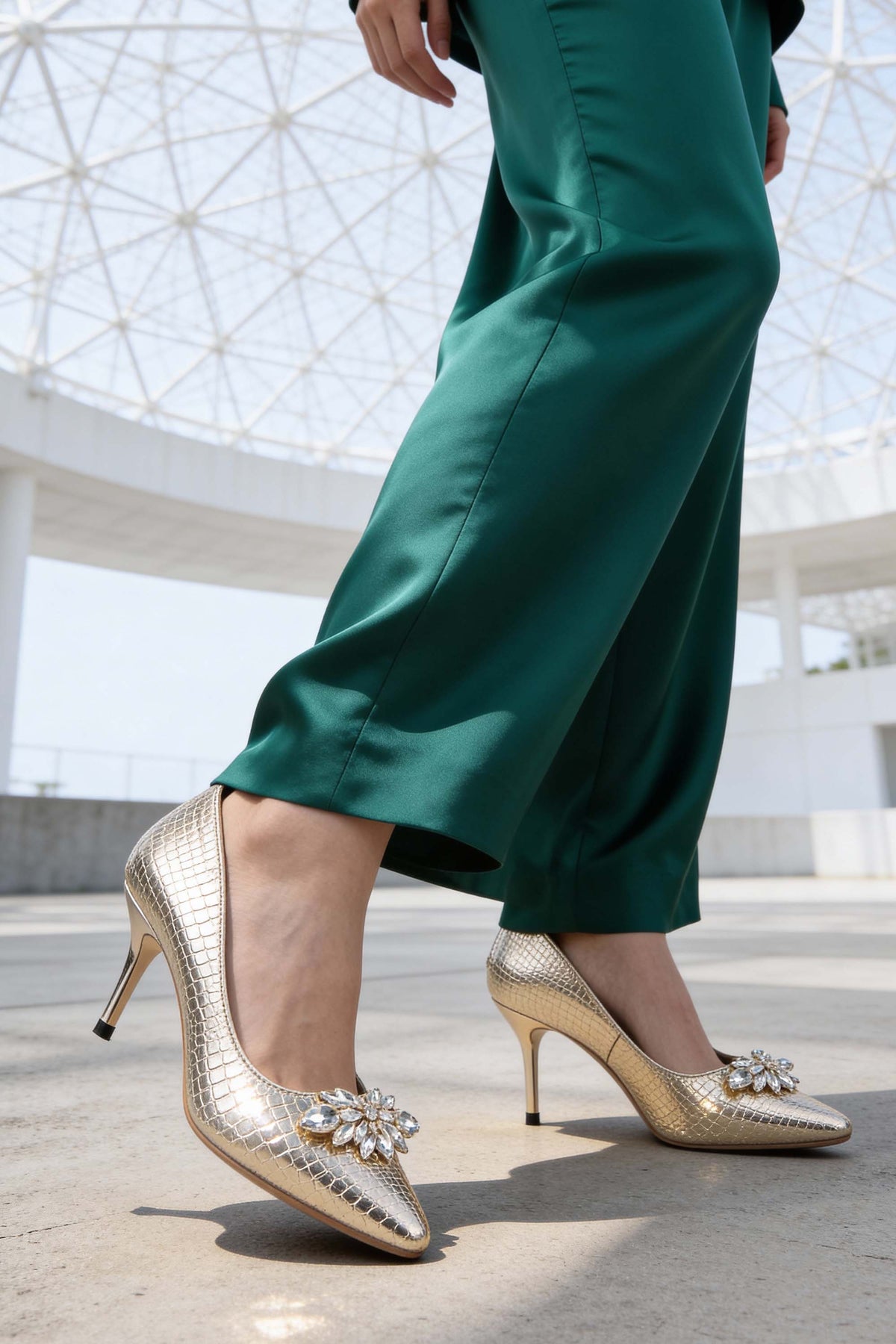These statement-making gold court shoes feature a crocodile textured metallic faux leather upper paired with premium stone buckle detailing. The 75 mm heel design is finished with a comfortable insole and an exclusive glitter outsole for an elegant touch.