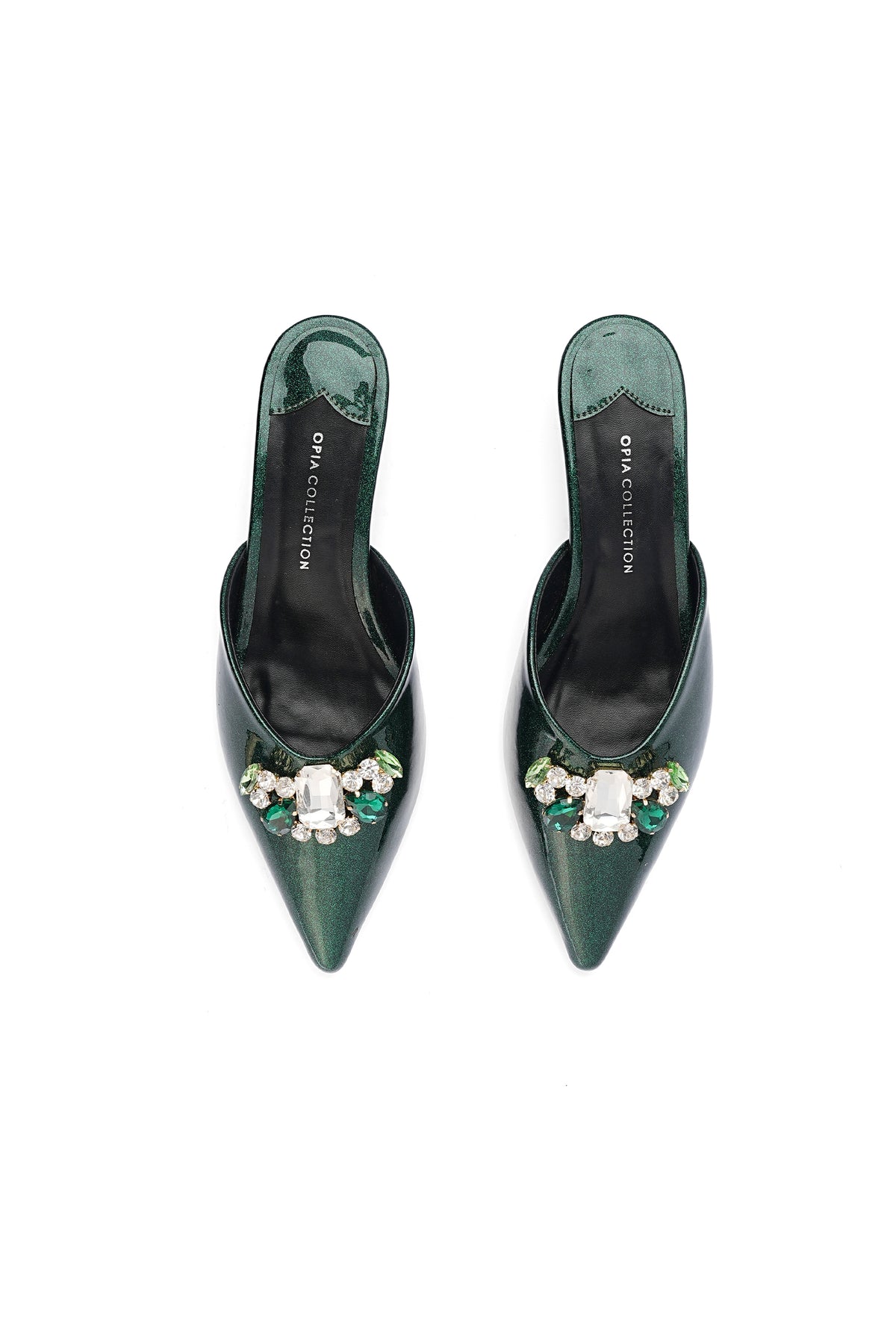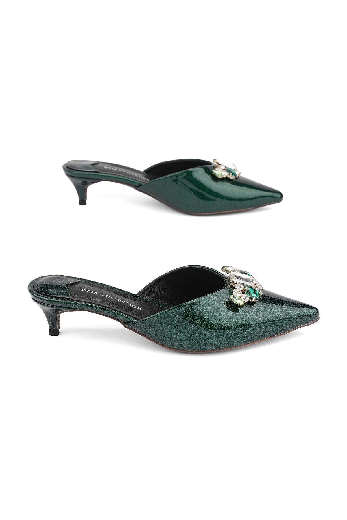 Green in color these elegant and chic ladies’ mules feature a glitter patent faux leather upper adorned with premium stone buckle details. A soft padded insole and kitten heel (39 mm) ensure both comfort and style for any occasion.