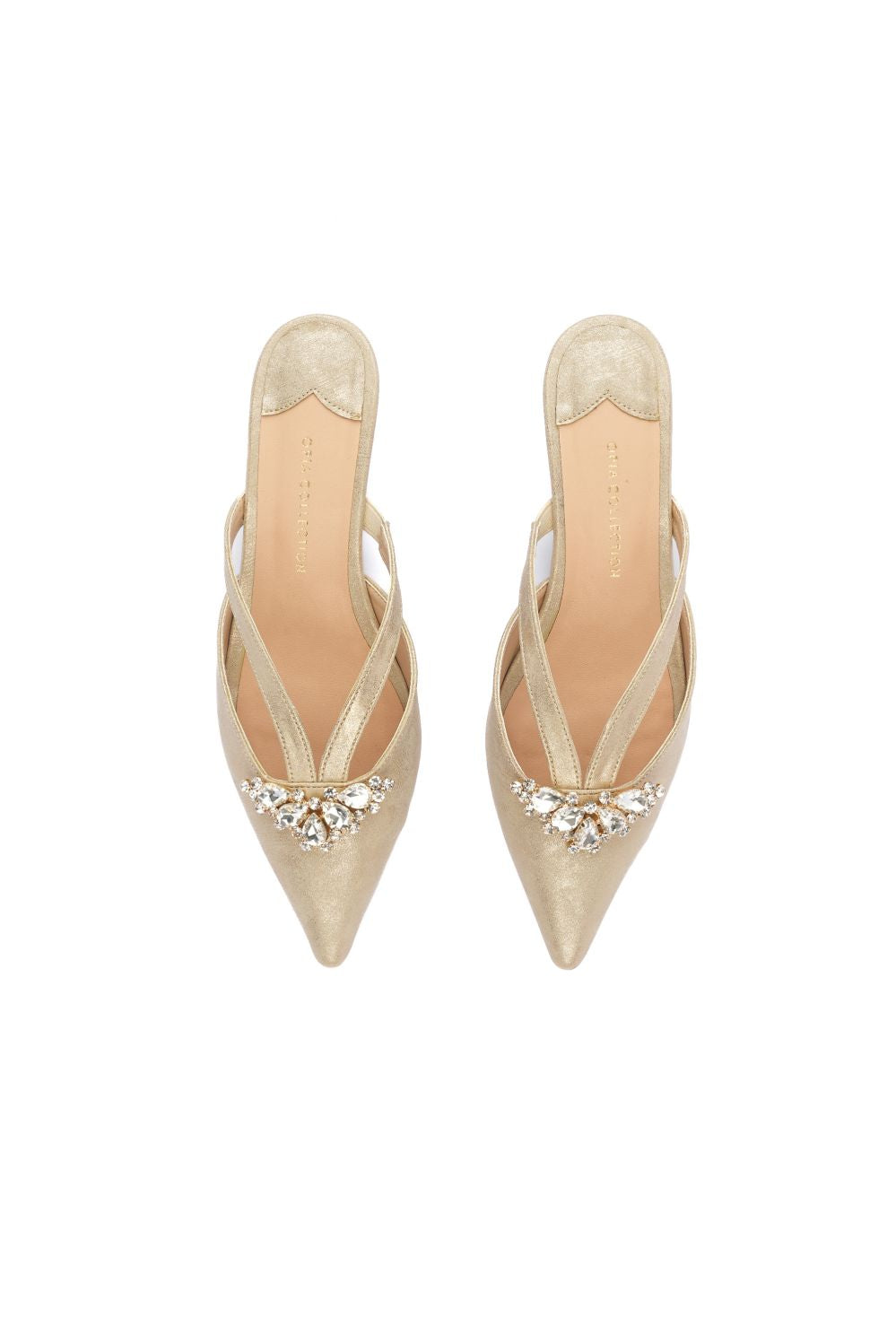 Elegant and eye-catching, these gold fancy ladies’ mules feature a two-tone metallic faux leather upper with elastic straps for a comfortable fit. The fancy buckle is on top is paired with comfort padded insole and a 39 mm kitten heel for glam.