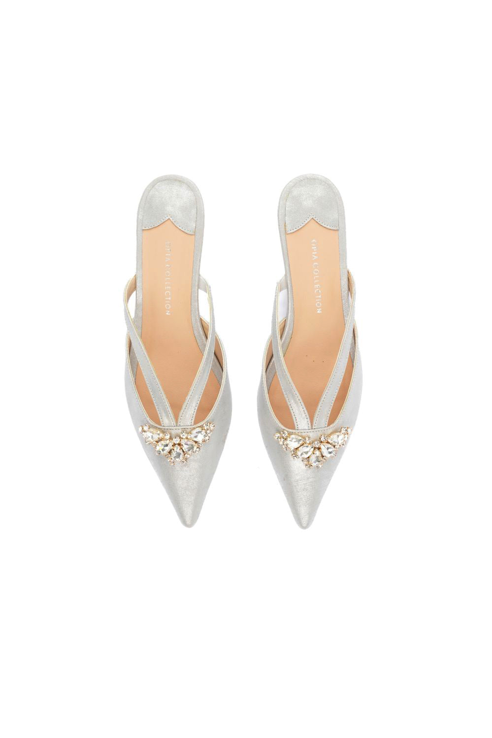 Elegant and eye-catching, these silver fancy ladies’ mules feature a two-tone metallic faux leather upper with elastic straps for a comfortable fit. The fancy buckle is on top is paired with comfort padded insole and a 39 mm kitten heel for glam.