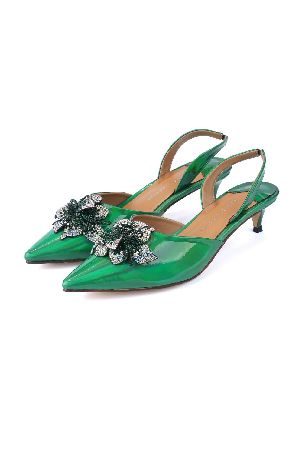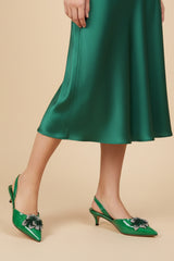 Chic and contemporary in design, these green fancy ladies’ mules feature a two-tone plastic upper accented with fancy buckle details. The comfort padded insole and kitten heel (39 mm) pair modern design with sheer elegance.