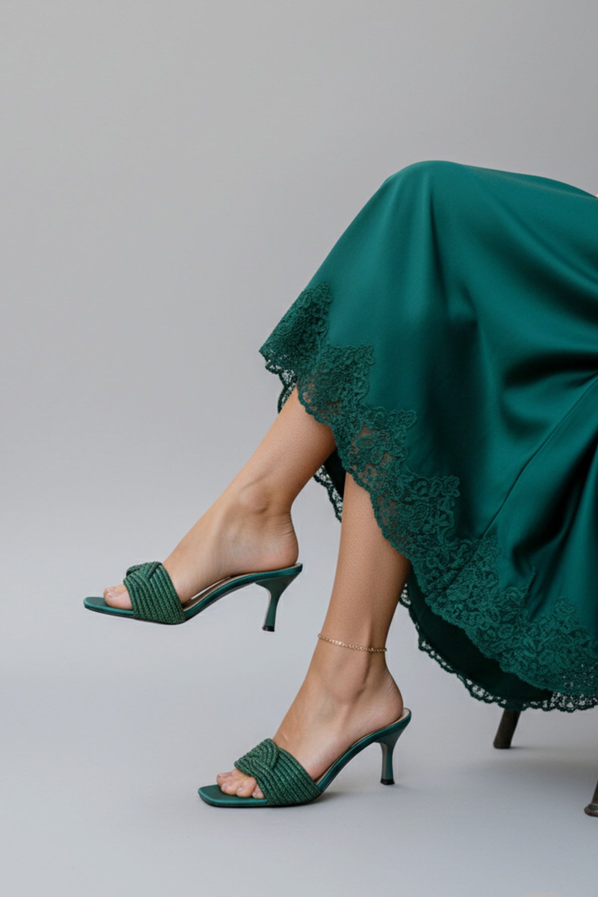 Glamourize your outfit with these gorgeous heels. They feature an emerald green color adorned with sparkling diamontees. Comfortable and chic, they're ideal for special occasions or a night out.