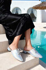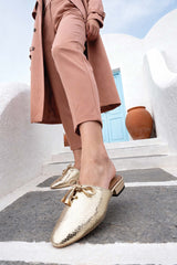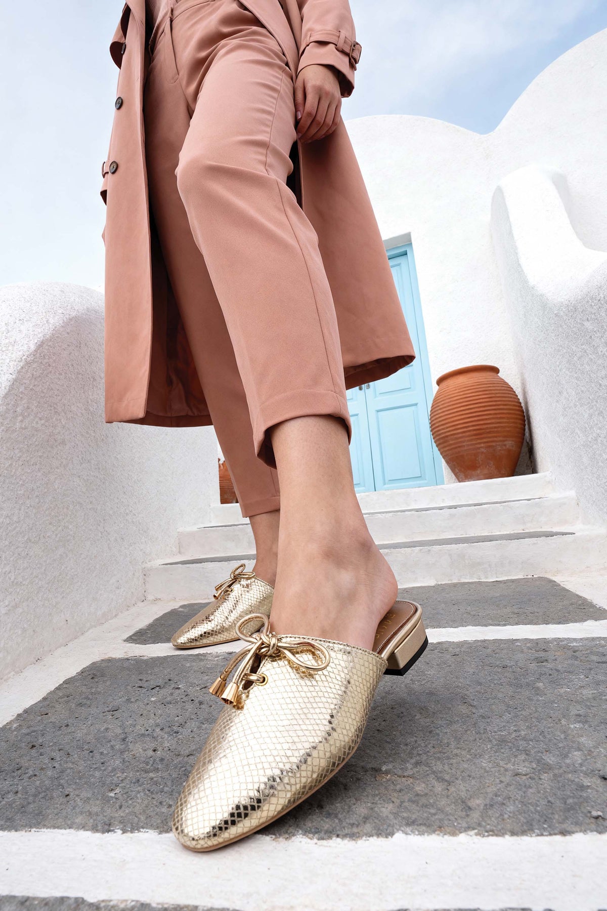 Gold in color this is a stylish and easy slip-on mule from our Opia collection. It has a metallic snake-textured finish and lace-up design for a secure and chic look. They have a soft cushioned insole with 22 mm heel height that keeps you comfortable all day.
