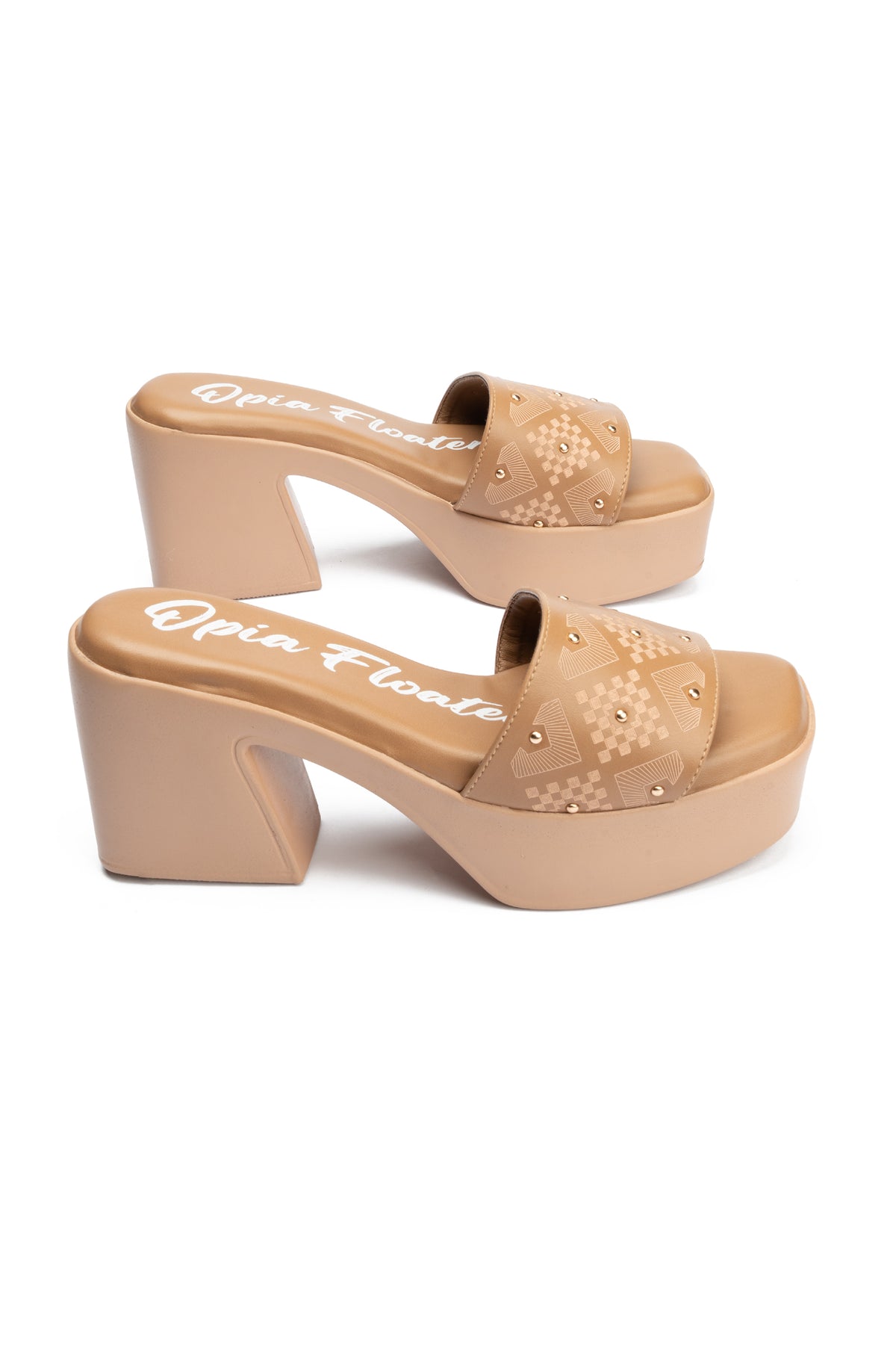 These stylish and comfortable beige heel slides feature a vegan leather upper decorated with metal studs and elegant printing. The extra soft padded insole and supportive heel ensure all-day comfort paired with a fashionable vibe.