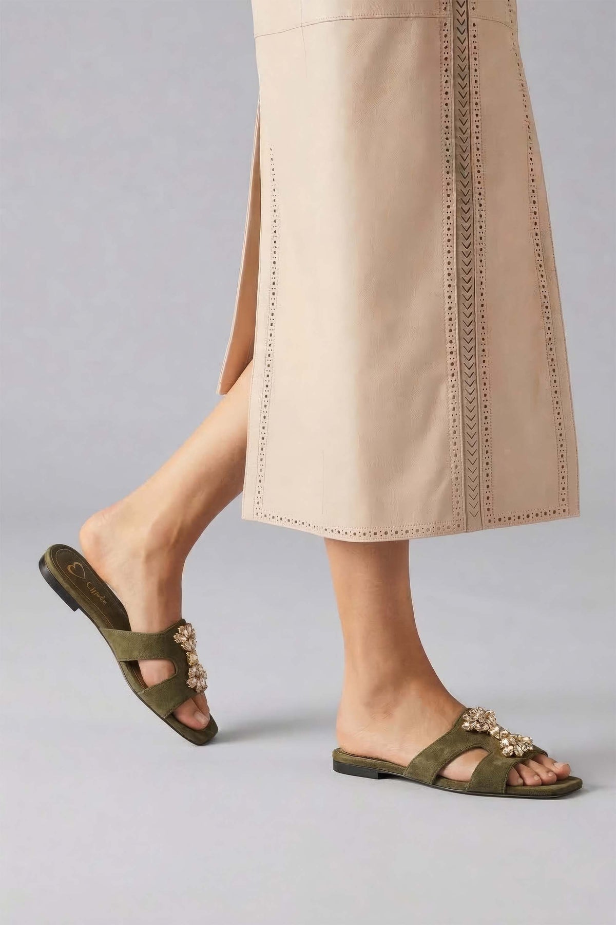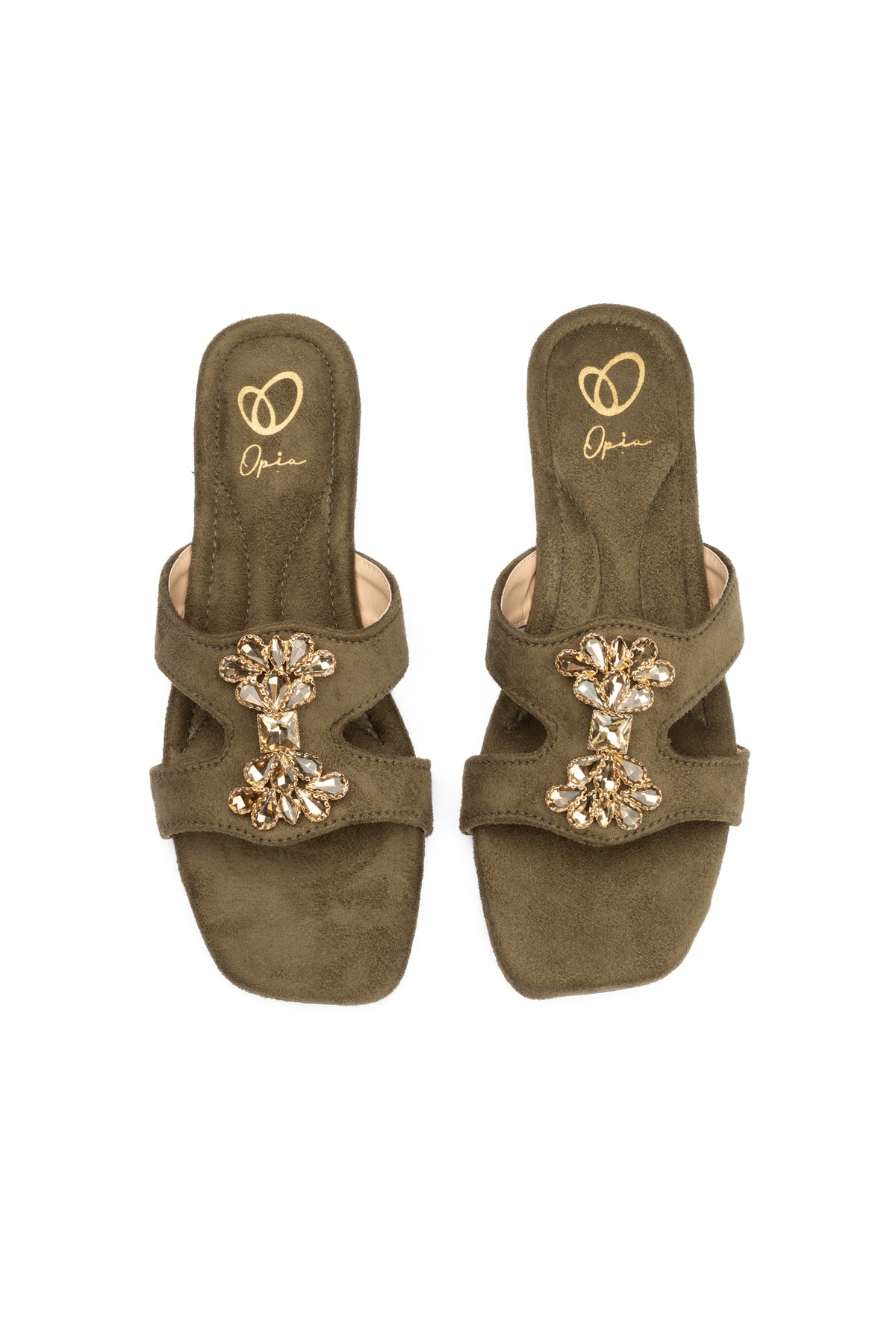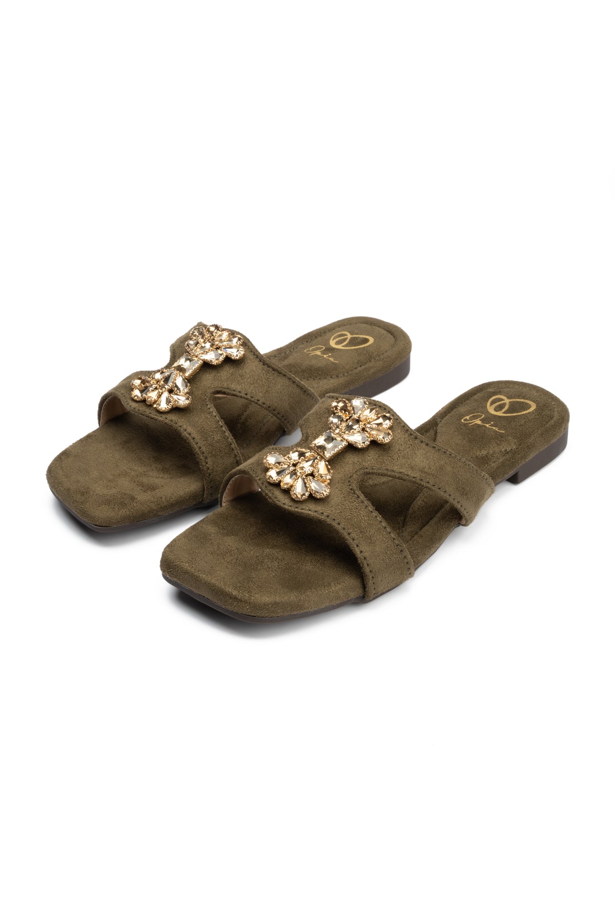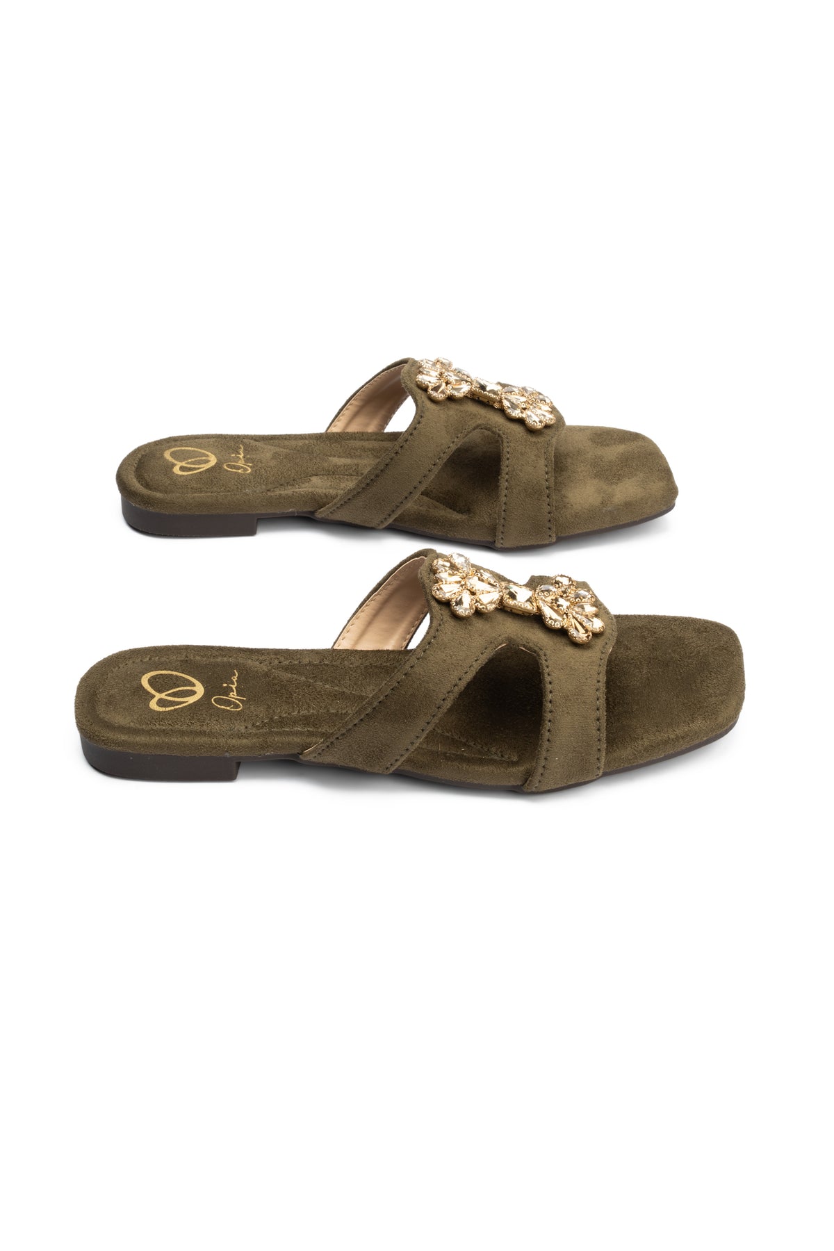 These comfortable flat green slides feature a soft suede vegan leather upper with elegant stone buckle details. The microfiber lining and padded suede insole ensure superior comfort for daily wear.