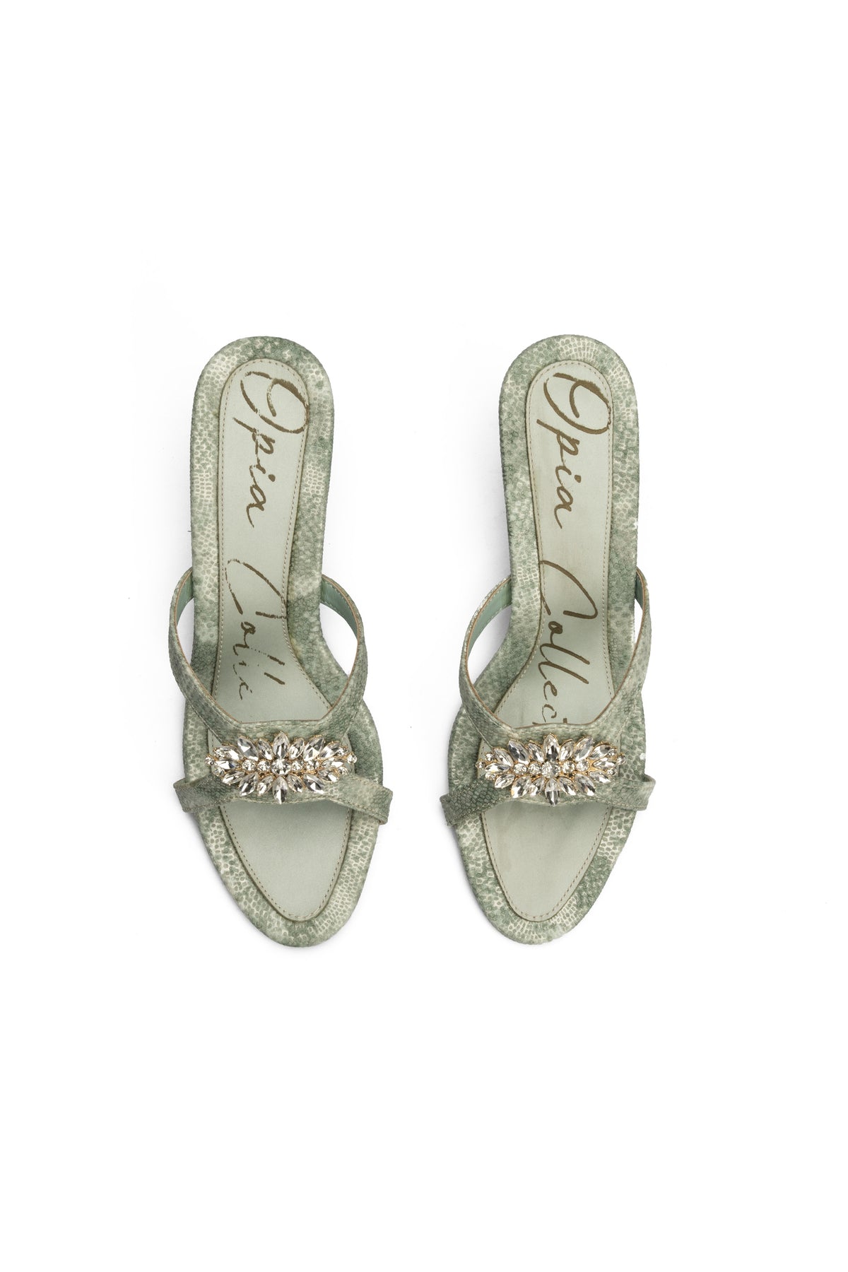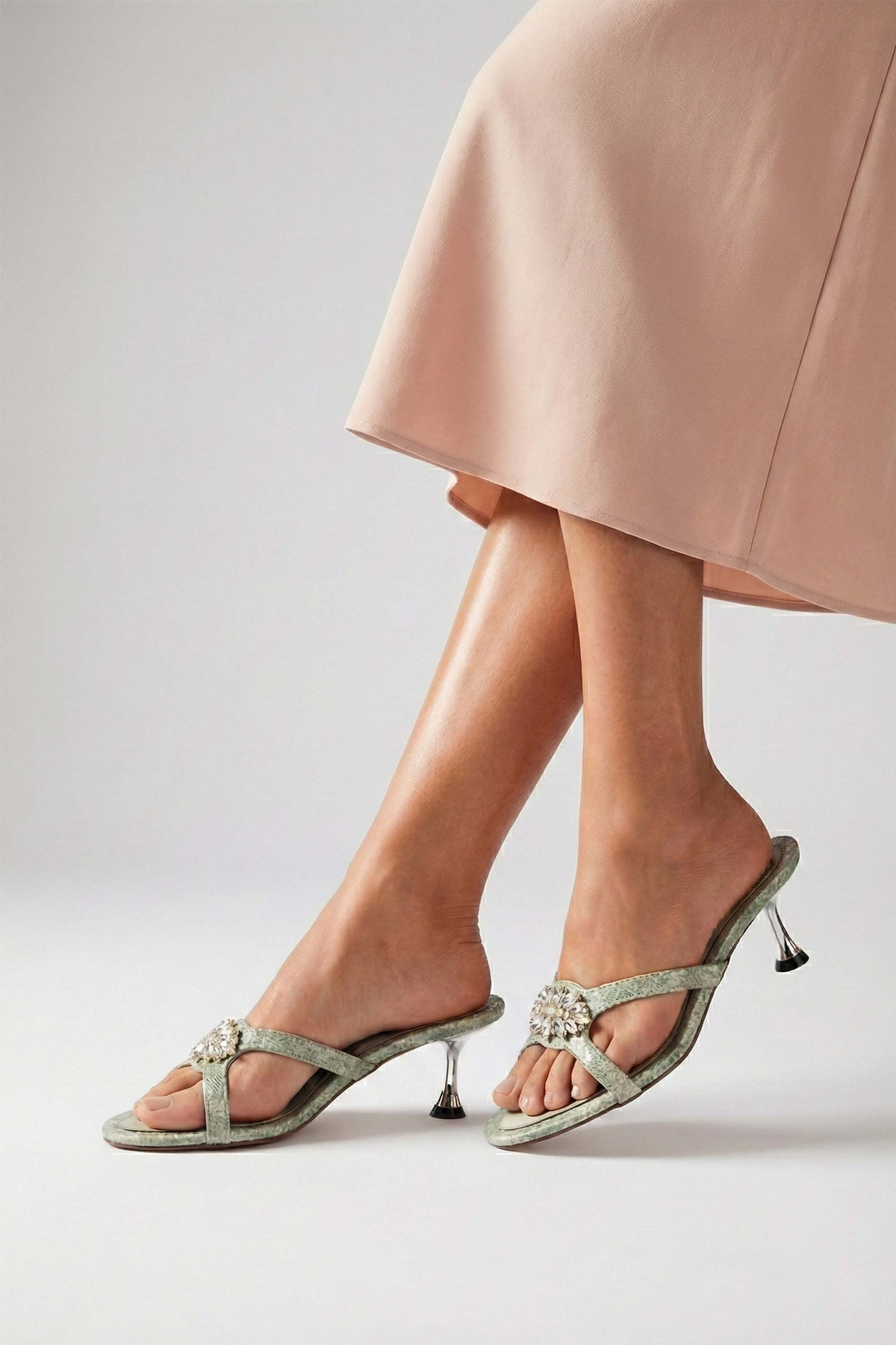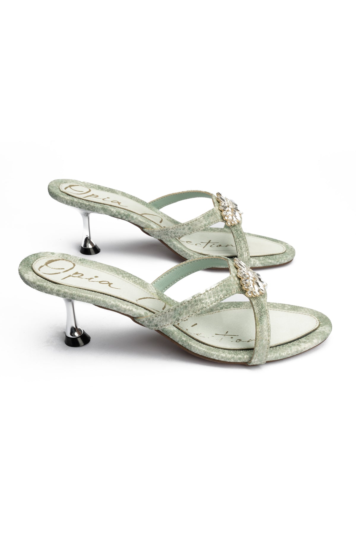 Stylish green heel slides are made with snake-textured vegan leather and premium metal buckle detailing for a bold, fashionable statement. They are designed with a satin comfort padded insole and exclusive heel design, these slides deliver elegance with reliable support.