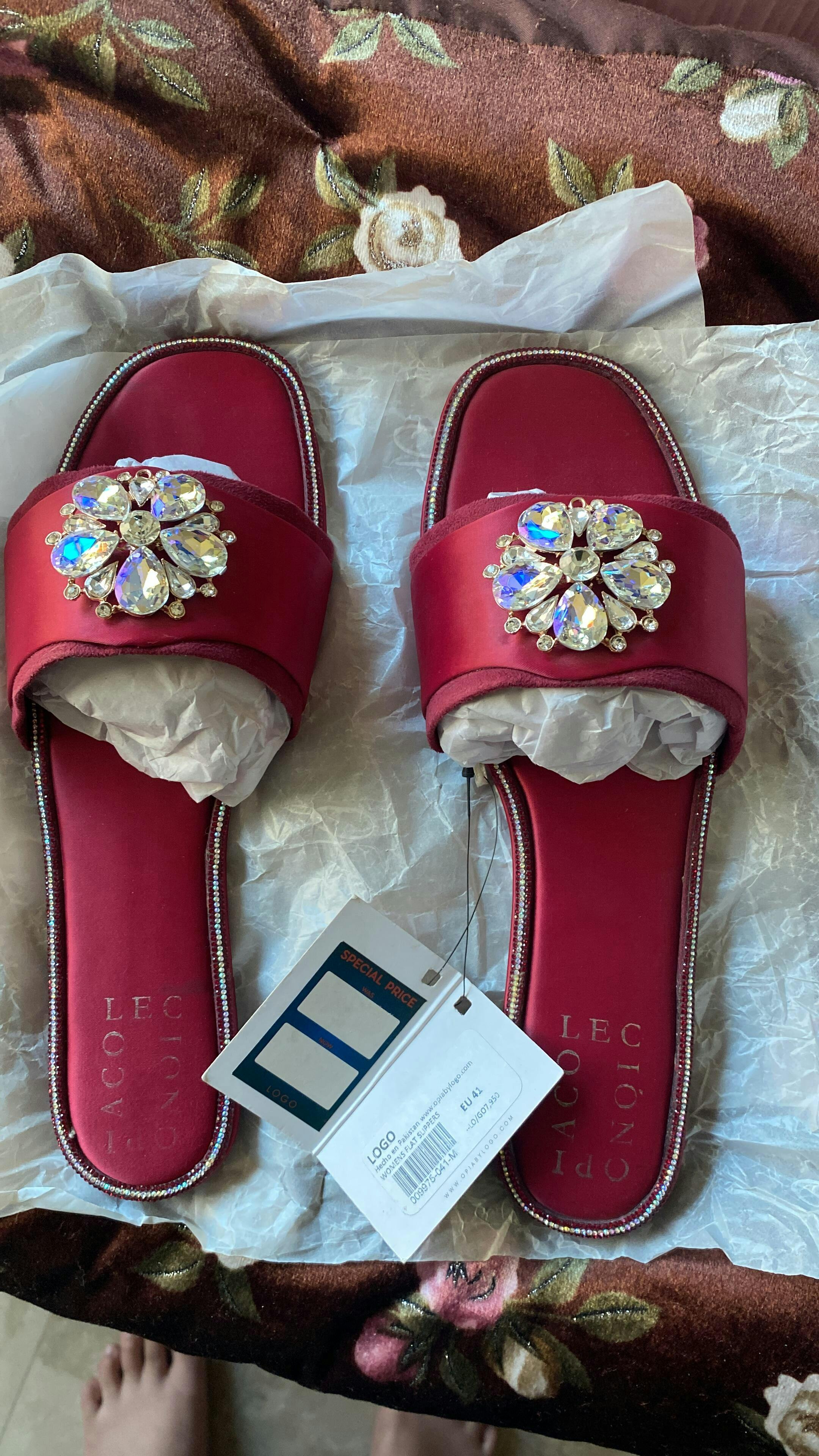 These eye-catching maroon flats feature a stunning arrangement of stones on top, with a delicate line of rhinestones along the edges for an added touch of sparkle. Perfect for making a statement while staying stylish and comfortable.