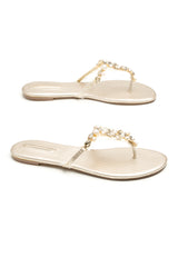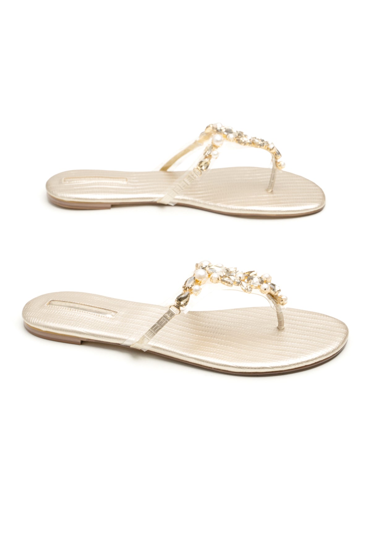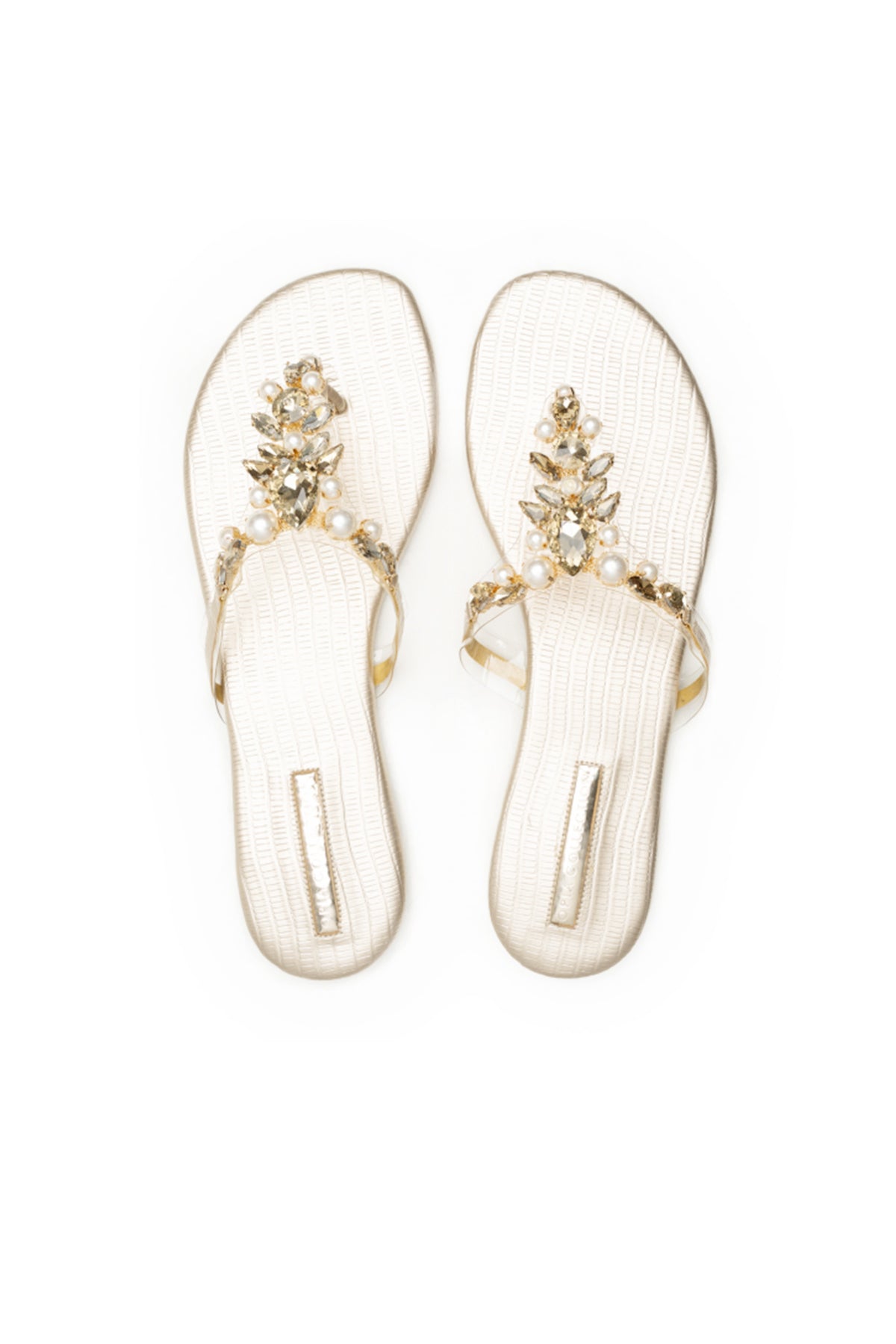 Minimalist in design these gold flats are beautifully adorned with an exquisite pearls and stones setting on top. The textured base of the footwear adds elegance to the design. Perfect to pair with semi-formal and formal attire.